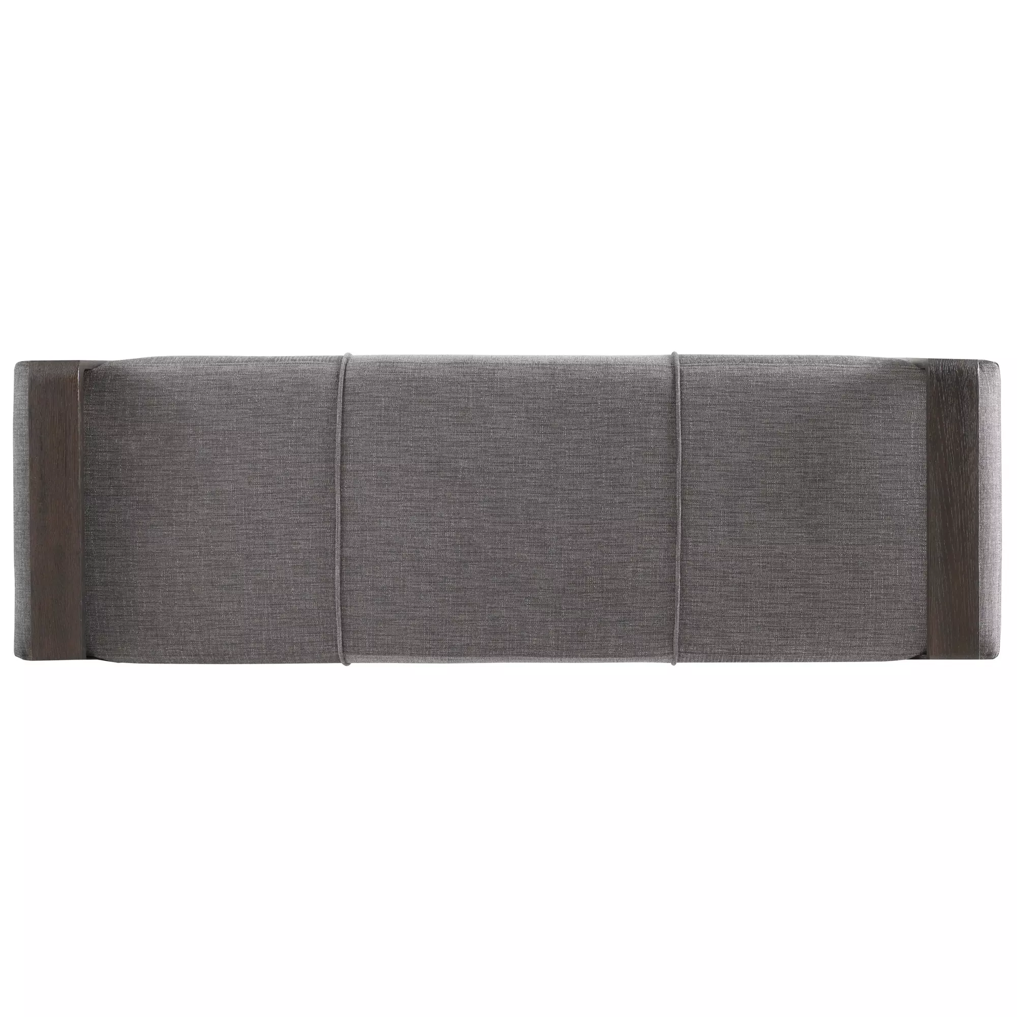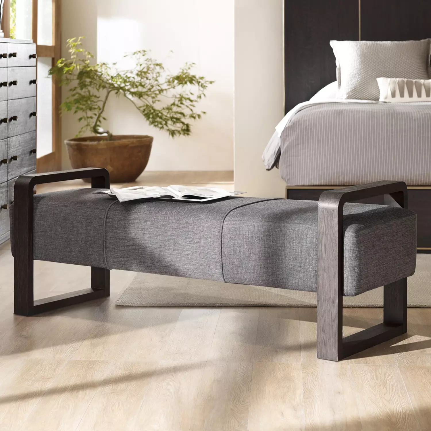 Chic, modern and inviting, the graphite gray upholstered seat of the Curata bench appears to be floating between the softly rounded rectangle ends finished in the deep brown Midnight.
