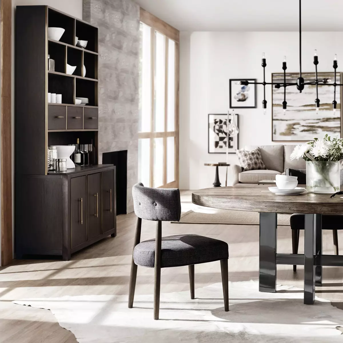 In an authentic mid-century modern silhouette, the versatile Curata Upholstered Chair exudes a curated chic appeal with a fabric seat and button-tufted back covered in Edward Graphite, with the wood frame finished in a medium greige color called Mountain Modern.