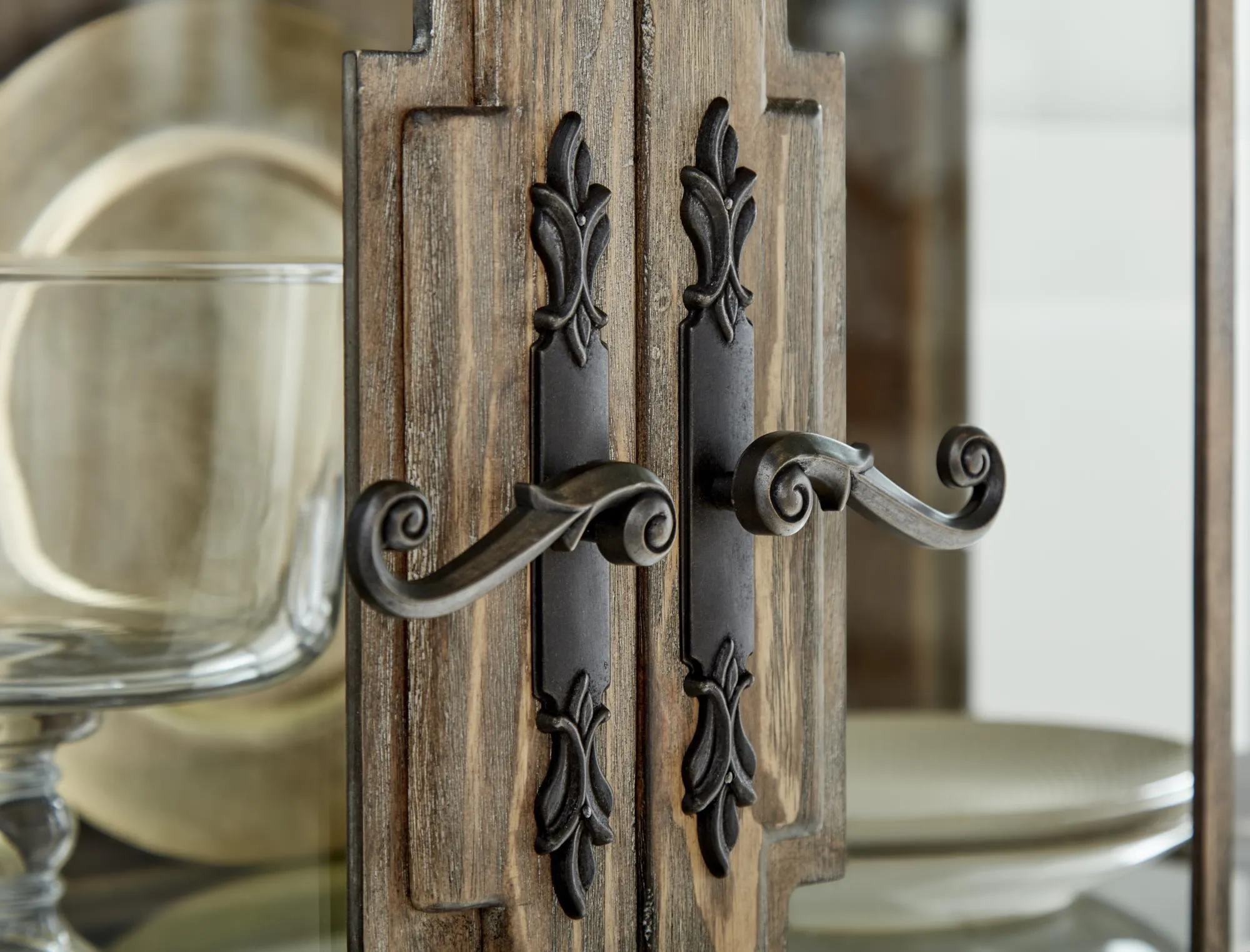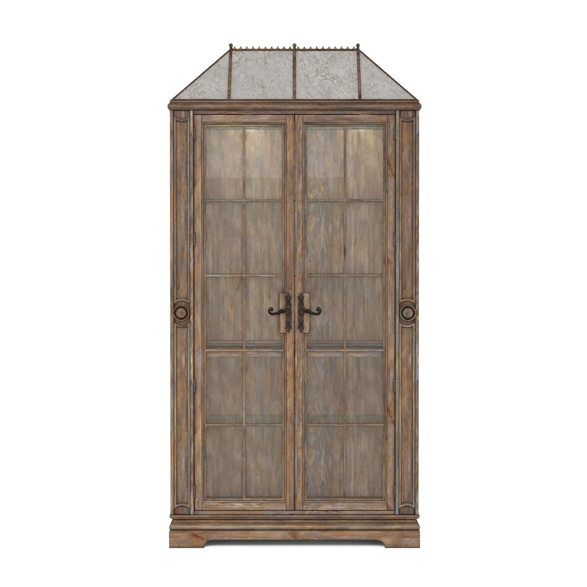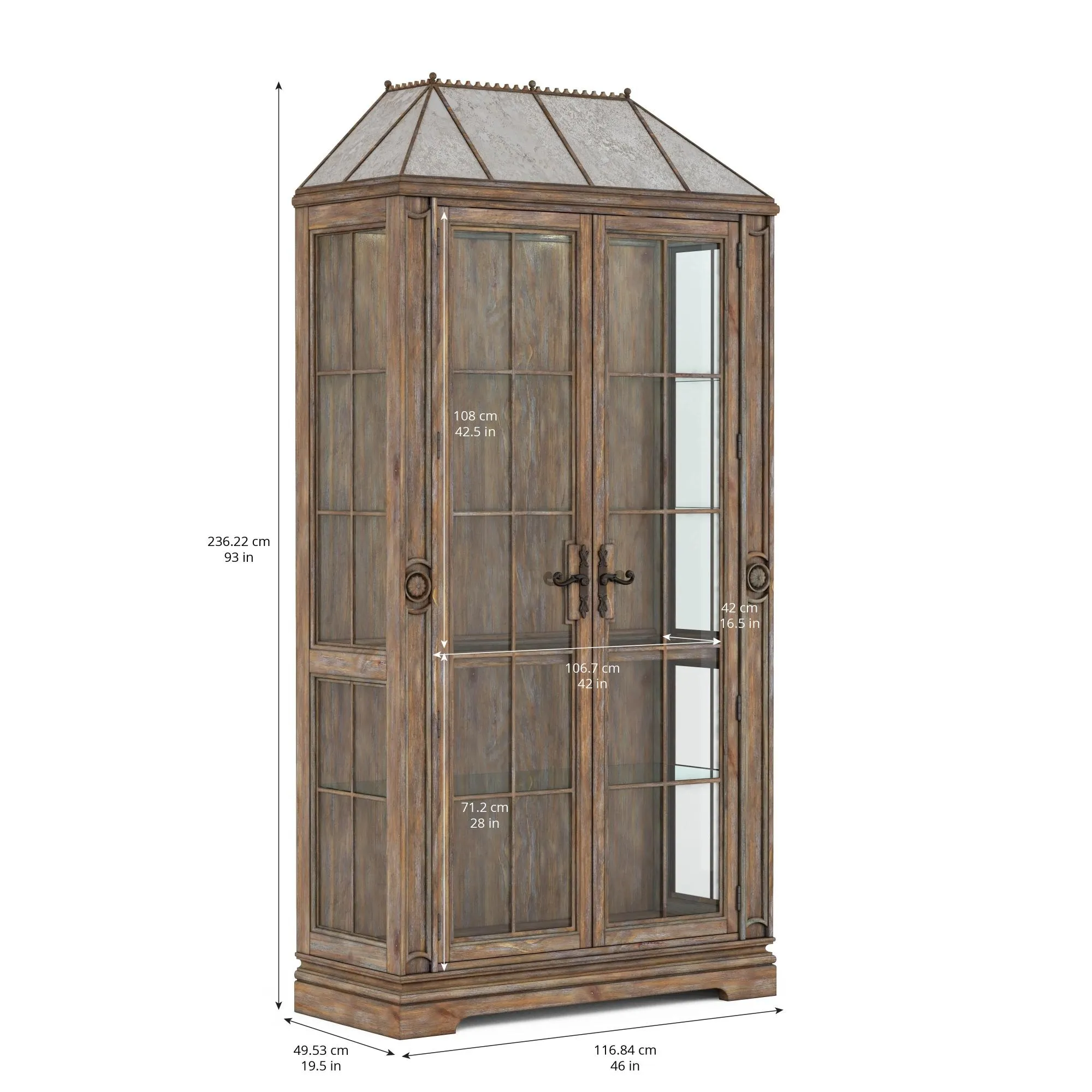 The interior is softly lit with interior touch-operated LED lighting, to gently bathe items placed on the four adjustable glass shelves in just a hint of light. The rustic pine doors are accented with traditional paneling including small medallions and ornate oil rubbed bronze handles, and it is crowned by an angled top that recalls the gracefully sloped roofs of European cities.