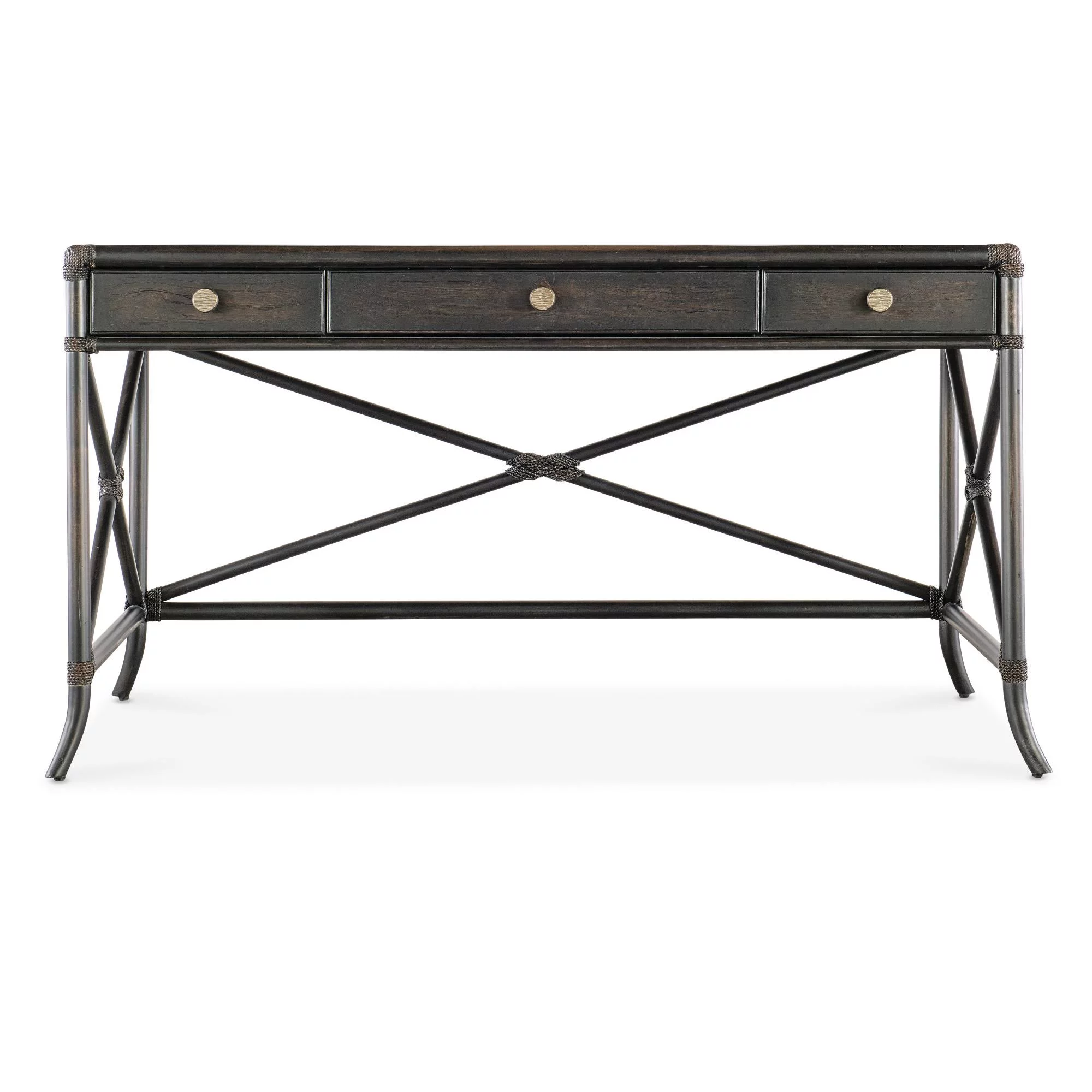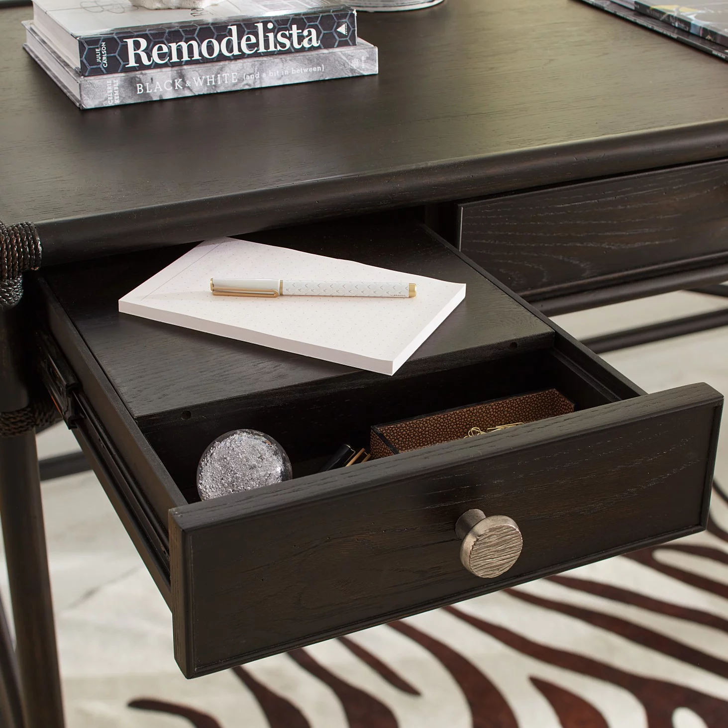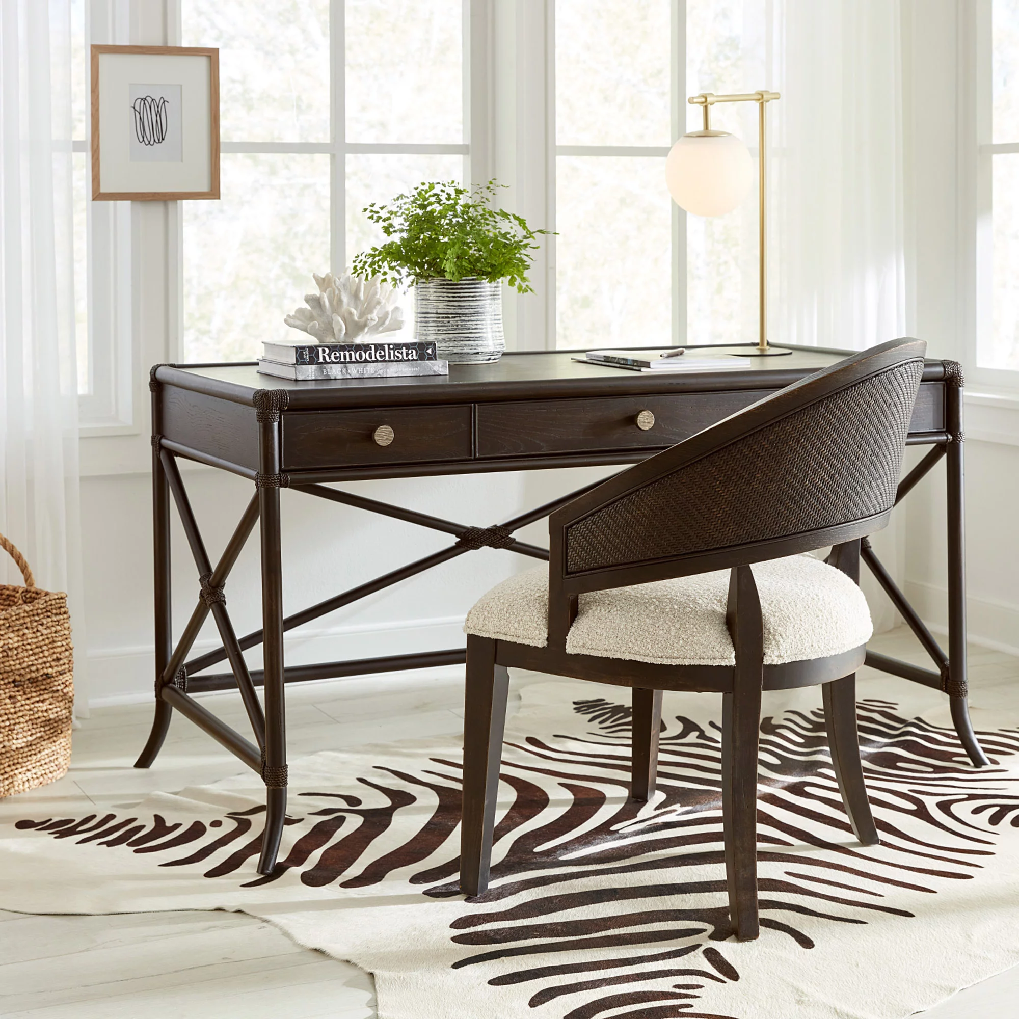 With the sublime vibe of an island oasis, the Retreat Writing Desk is crafted of Oak and Maple Veneers in a Bamboo motif and accented by rope. X-design stretchers on the back and sides distinguish the piece, along with the Black Sand finish, transparent by design to showcase the unique patterns of the wood veneer. Featuring three drawers, the left and right drawers have two removable dividers. One pencil tray and one writing slide may be used on either side, and the center drawer has a drop-front for keyboard use. Finished on all sides.