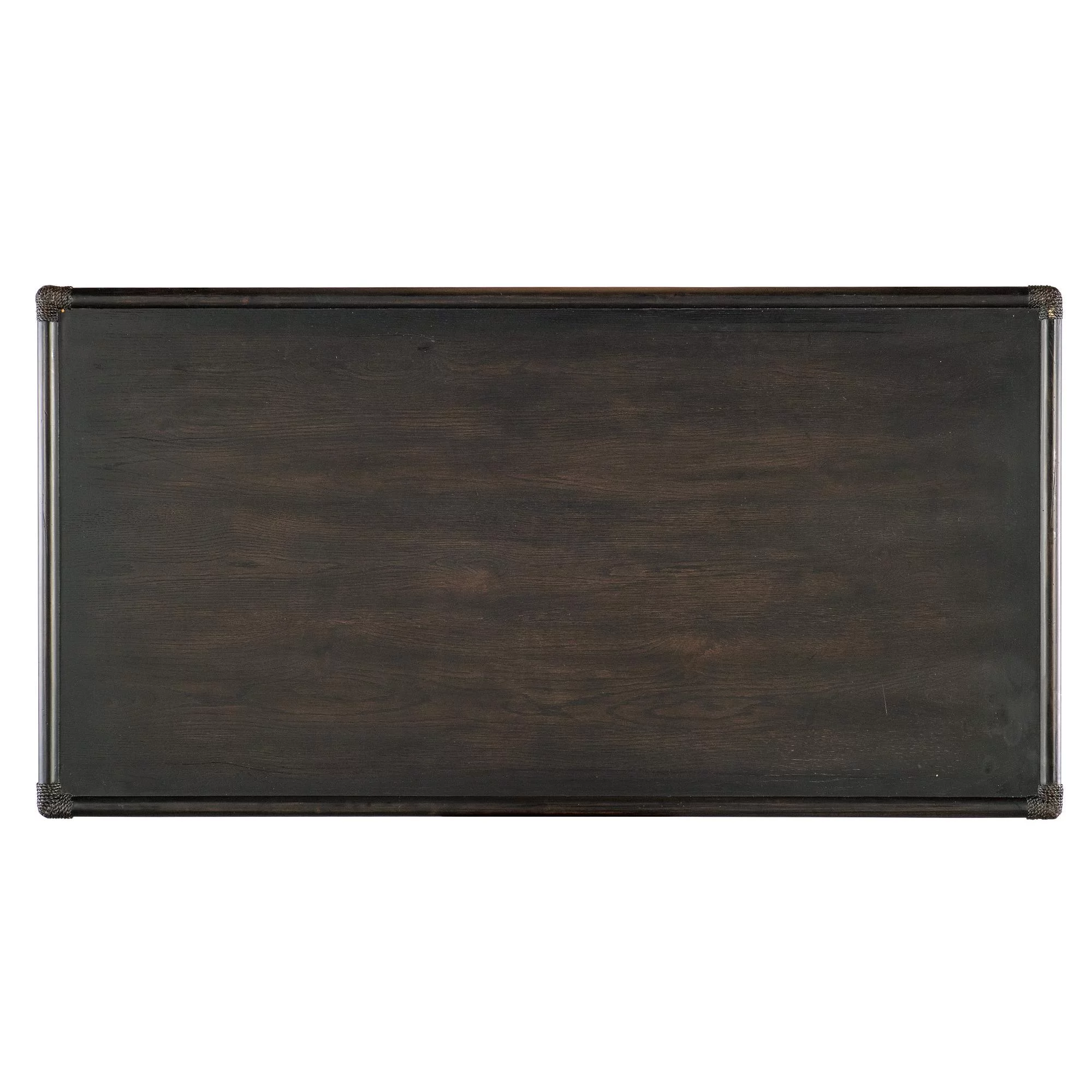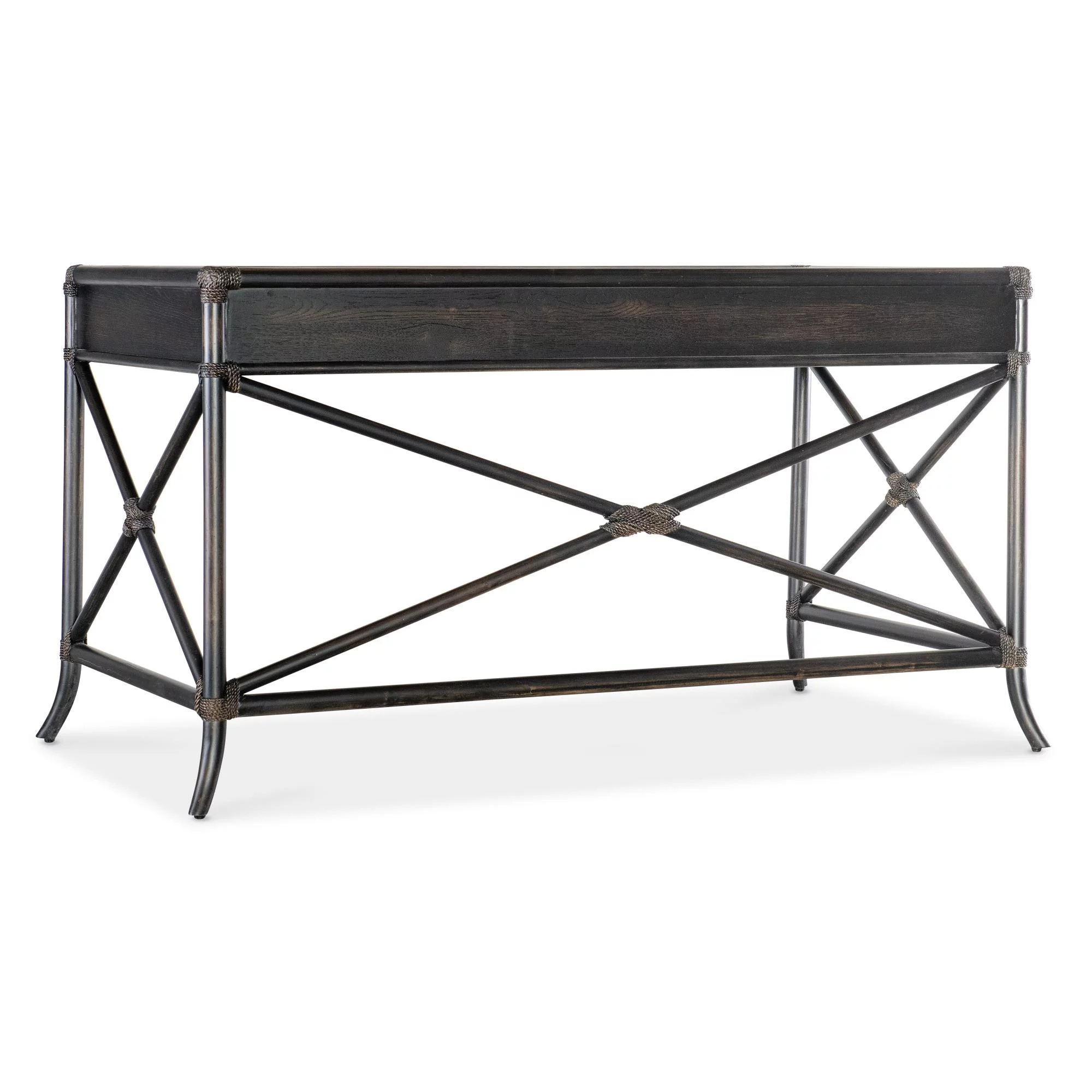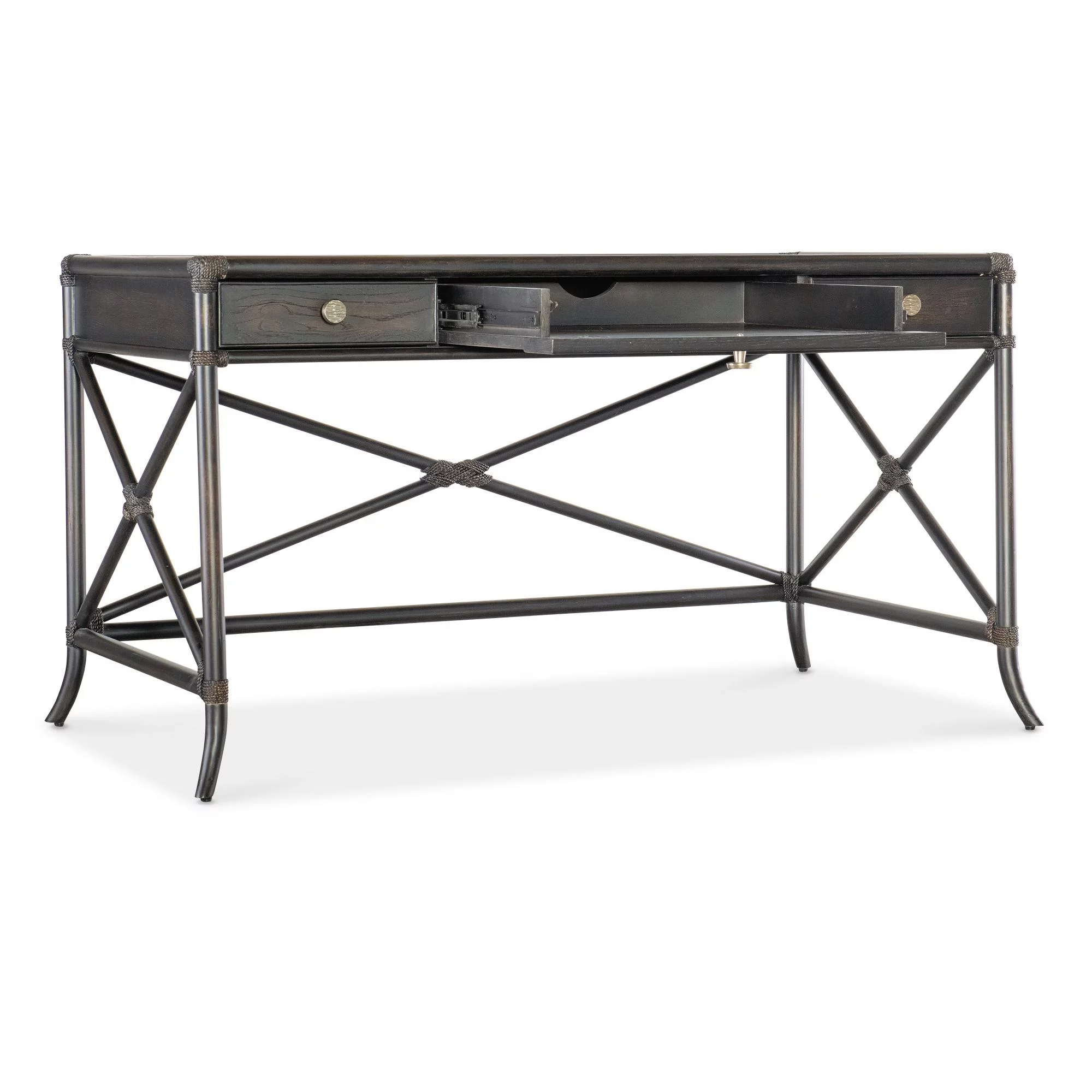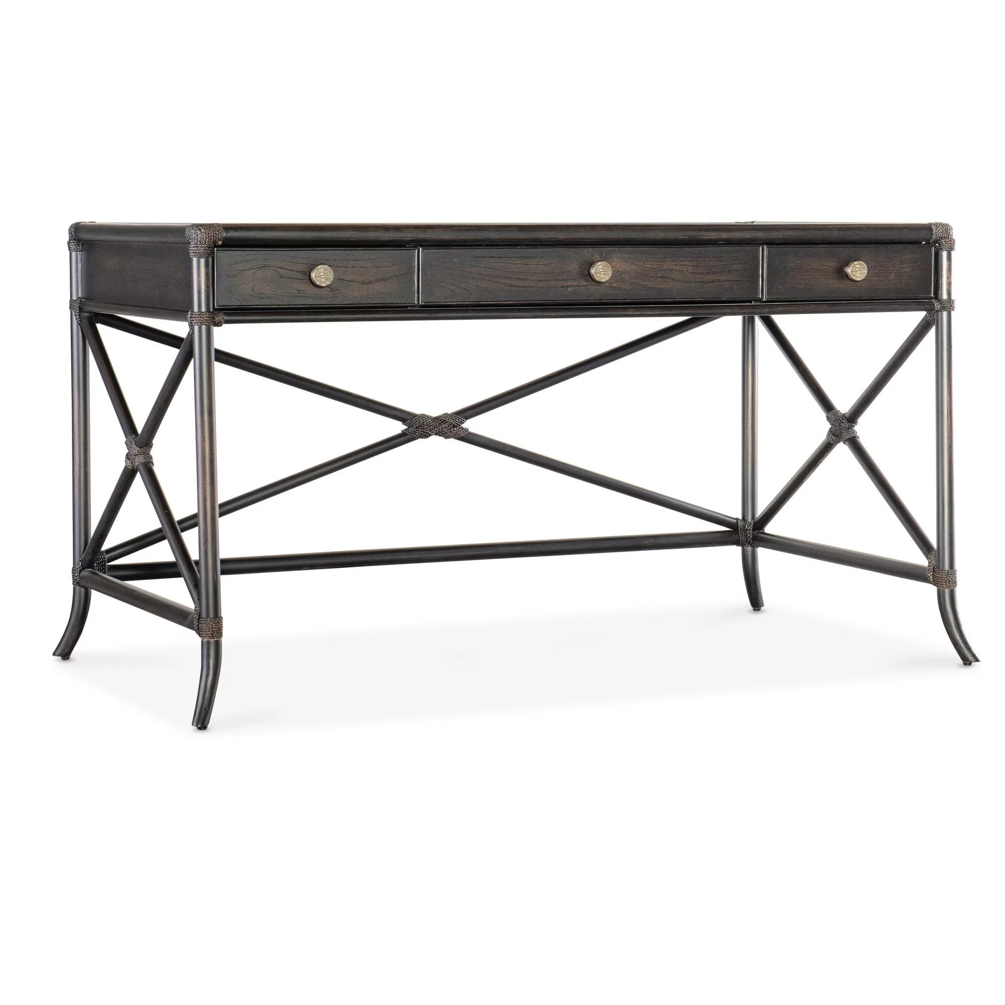 With the sublime vibe of an island oasis, the Retreat Writing Desk is crafted of Oak and Maple Veneers in a Bamboo motif and accented by rope. X-design stretchers on the back and sides distinguish the piece, along with the Black Sand finish, transparent by design to showcase the unique patterns of the wood veneer. Featuring three drawers, the left and right drawers have two removable dividers. One pencil tray and one writing slide may be used on either side, and the center drawer has a drop-front for keyboard use. Finished on all sides.