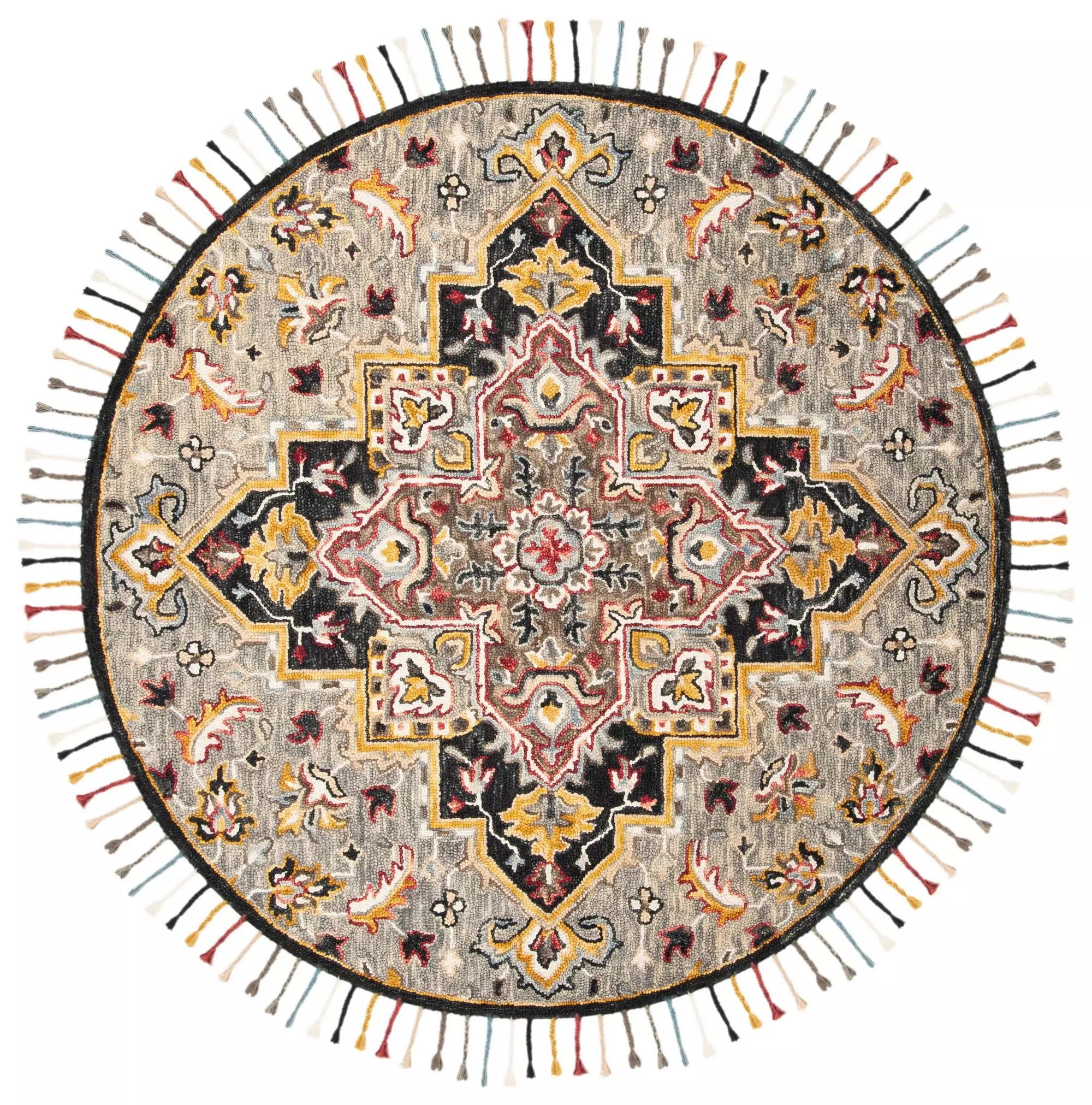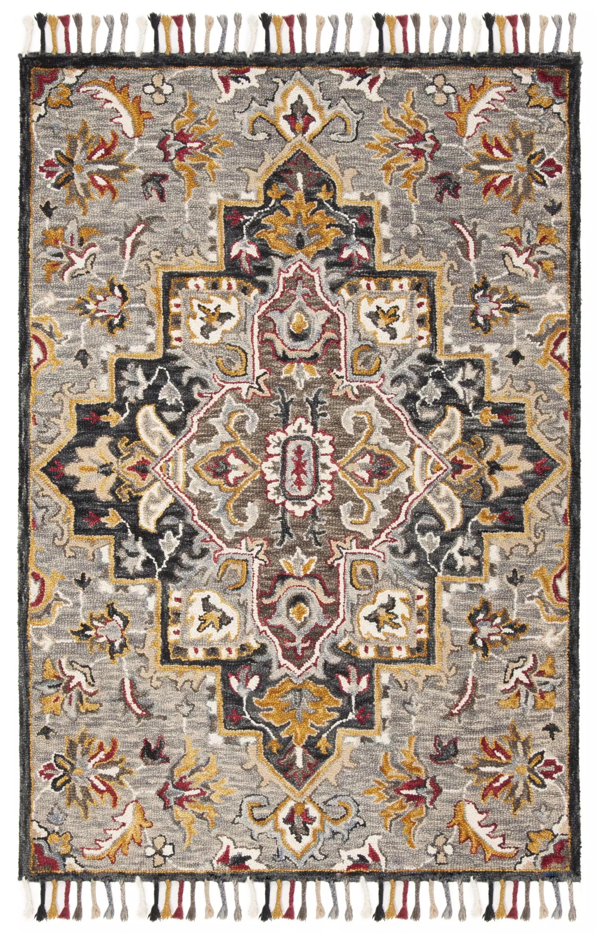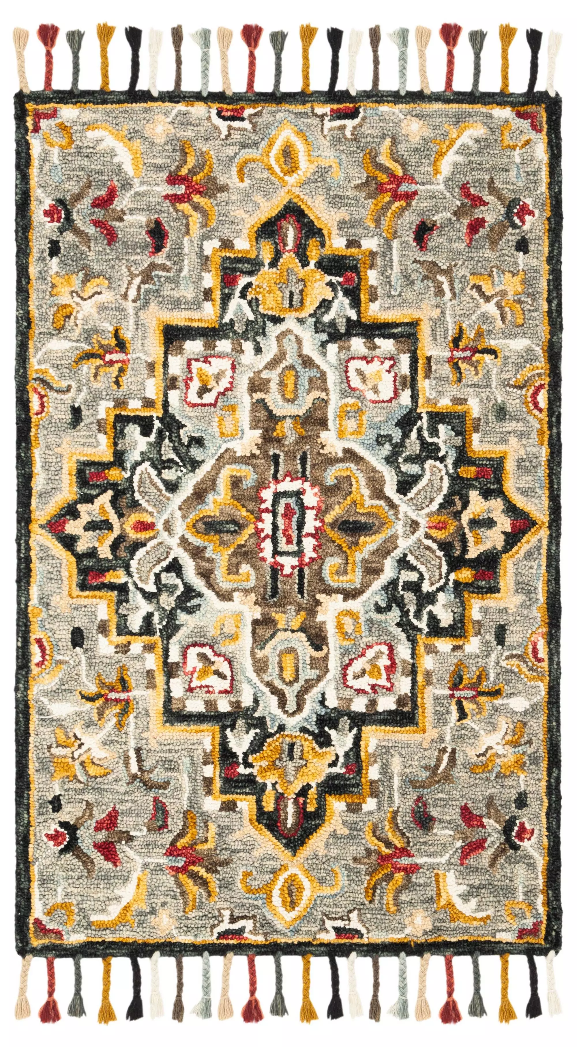 Inspired by the cozy ski lodges of Colorado, the Aspen Collection features fashionable geometric tribal patterned rugs. Using main accent colors of red, blue, and yellow, skilled artisans hand-tuft these wool rugs for exceptional clarity of color and design.