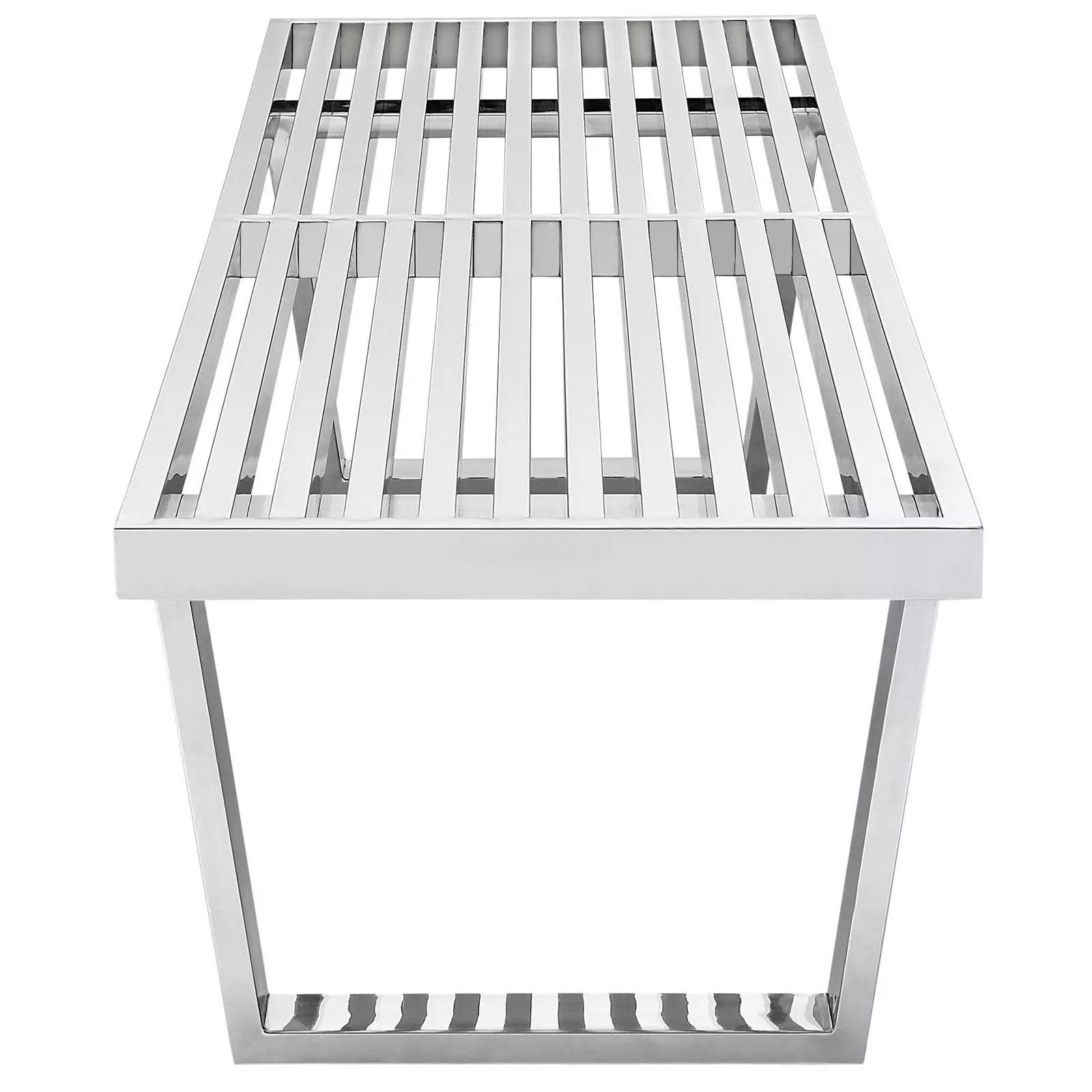 In order to propose an answer, we need to first look into the specifics. The surface is comprised of a slotted square rectangular design. While the base is constructed of solidly welded pieces of metal, there are no legs in the classic understanding of legs. Also, the vertical metal slats of metal are slanted.