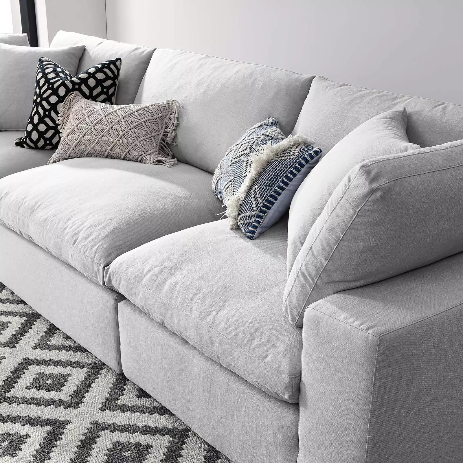 Commix comes with generously padded down feather and cotton cushions, and padded foam bases, making this sectional sofa collection perfect for the living room, family room, or game room. Made for sprawling out or curling up, Commix beckons you and guests to sit and stay a while. Includes plastic foot glides.