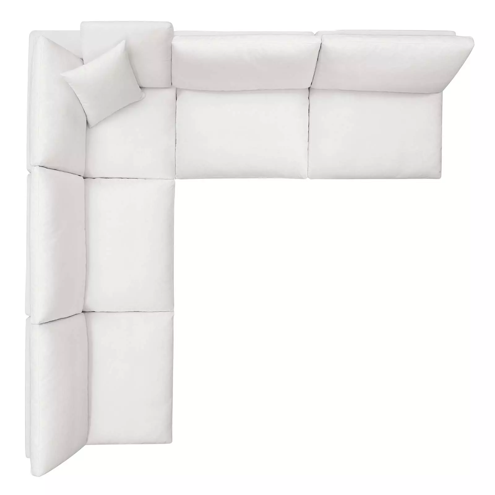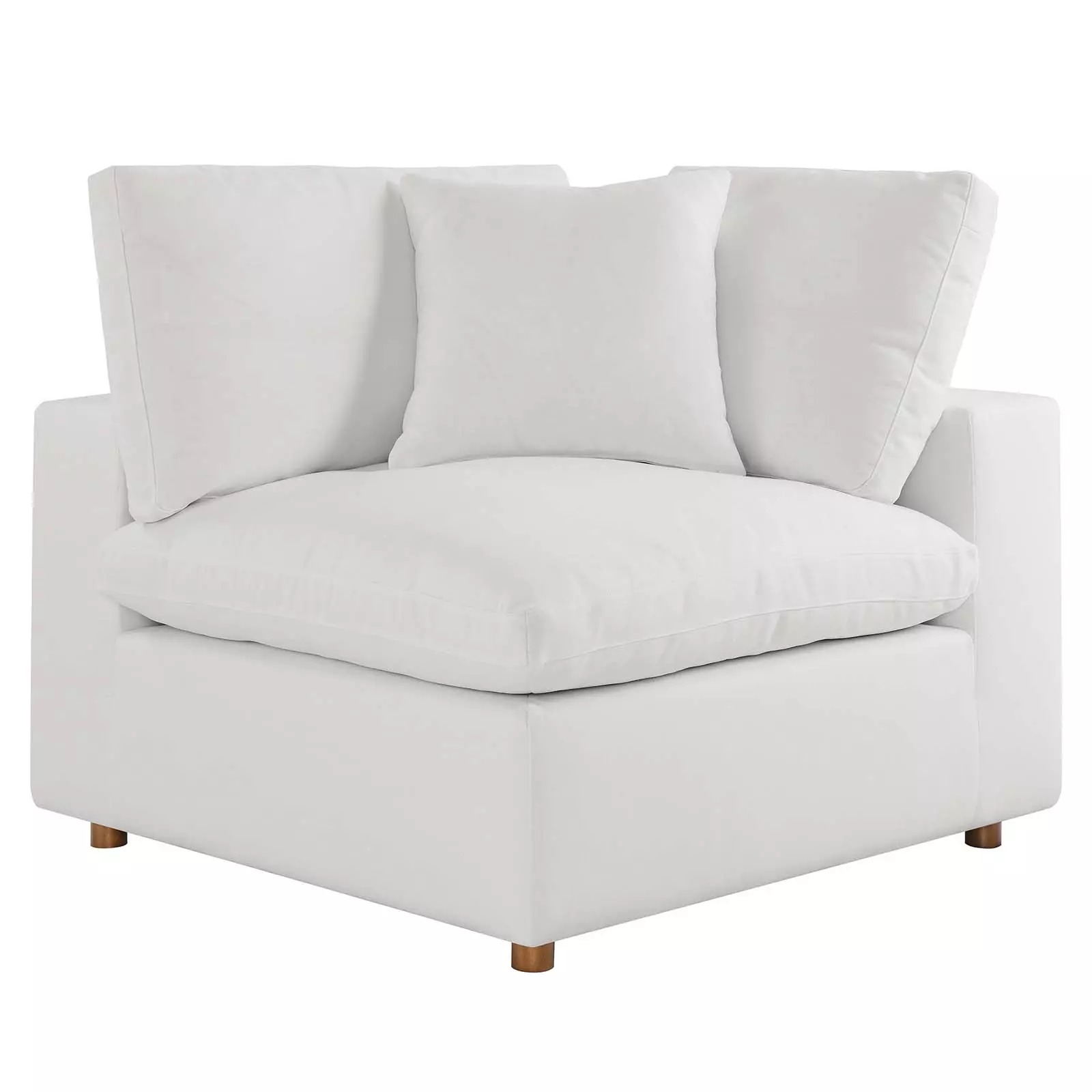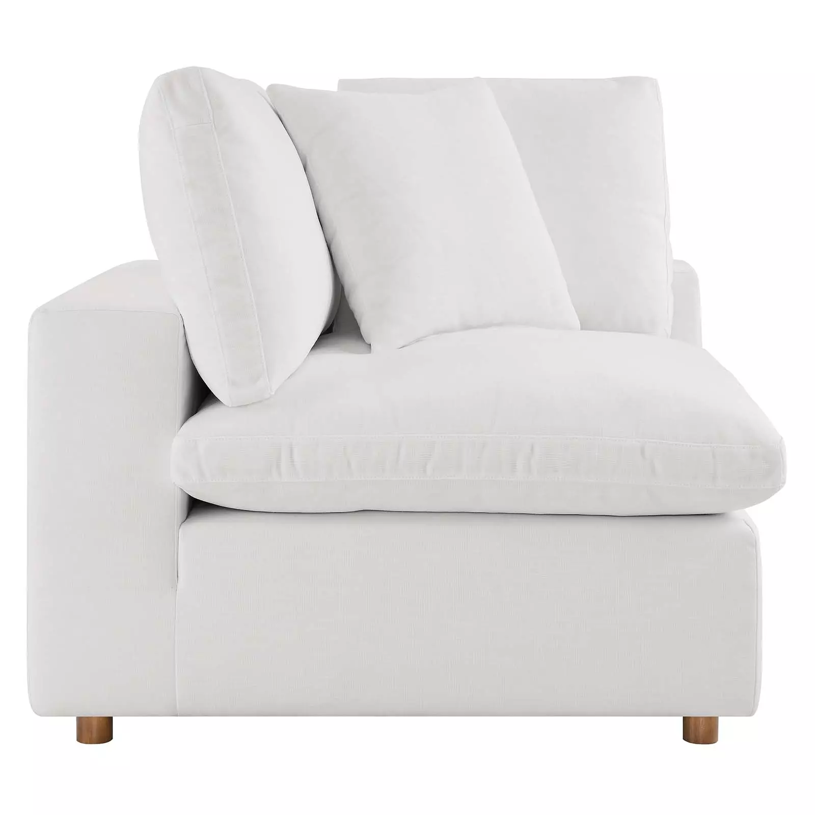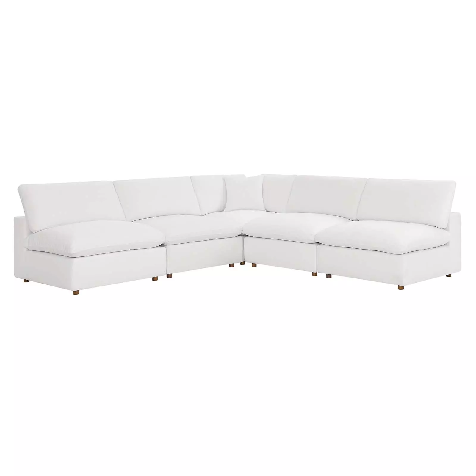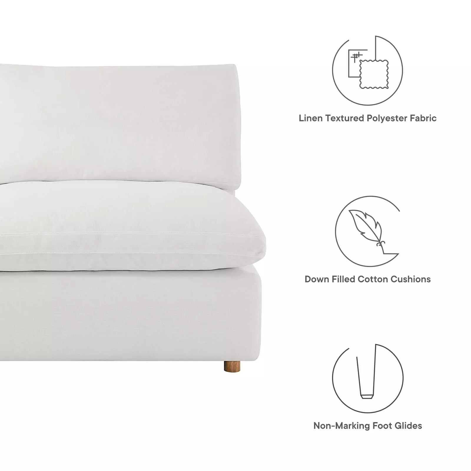 A haven for cozy relaxation, Commix features plush comfort, clean-lined design, and spacious profile, that makes an attractive statement in the modern home. Upholstered in polyester fabric that grants a luxe linen texture, this contemporary sectional sofa comes with solid wood construction and cotton and down cushions for a luxurious sink-in feel. Commix comes with generously padded down feather and cotton cushions, and padded foam bases, making this sectional sofa collection perfect for the living room, family room, or game room. Made for sprawling out or curling up, Commix beckons you and guests to sit and stay a while. Includes plastic foot glides. Corner piece includes two back pillows and a throw pillow. Each Seat Weight Capacity: 331 lbs. Set Includes: Four - Commix Down Filled Overstuffed Armless Chair One - Commix Down Filled Overstuffed Corner Chair