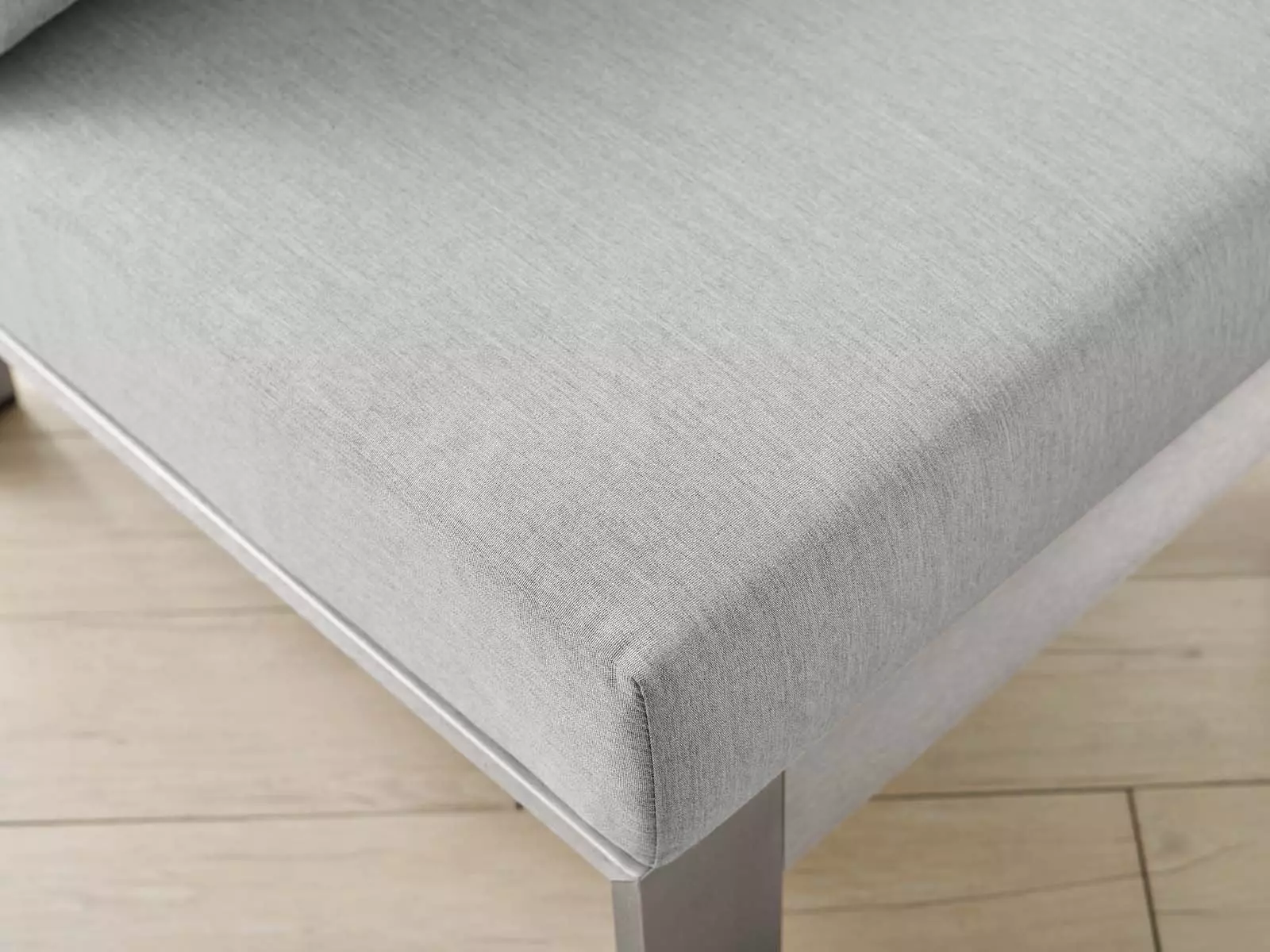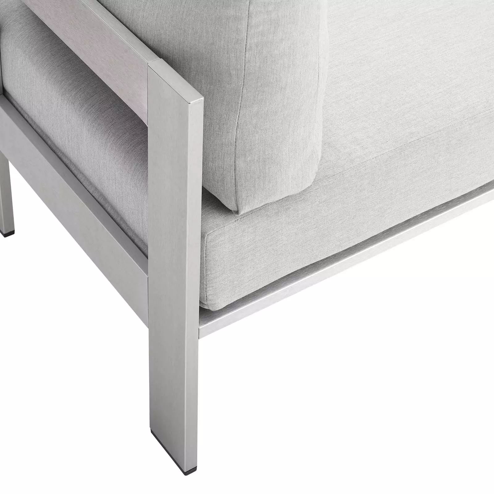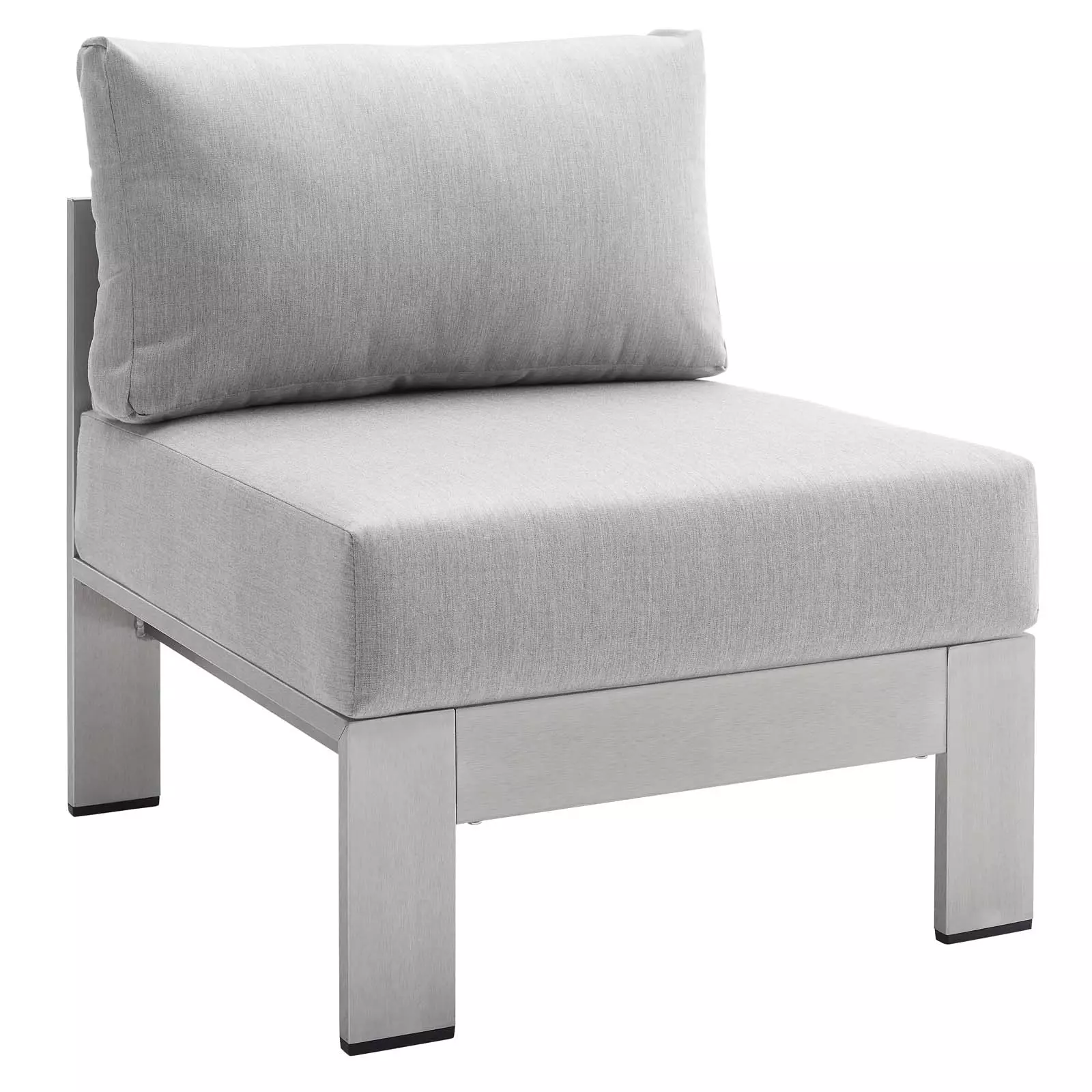 Enjoy your patio or backyard leisure time with the strong and durable Shore Outdoor Aluminum Armless Chair. Made with an anodized brushed aluminum frame and non-marking black plastic foot caps, Shore comes outfitted with resilient Sunbrella® fabric canvas cushions tested to last through all weather conditions. The Shore Outdoor Aluminum Armless Chair complements your casual gatherings with a look and functionality you can rely on. Set Includes: One - Shore Sunbrella® Fabric Aluminum Armless Chair