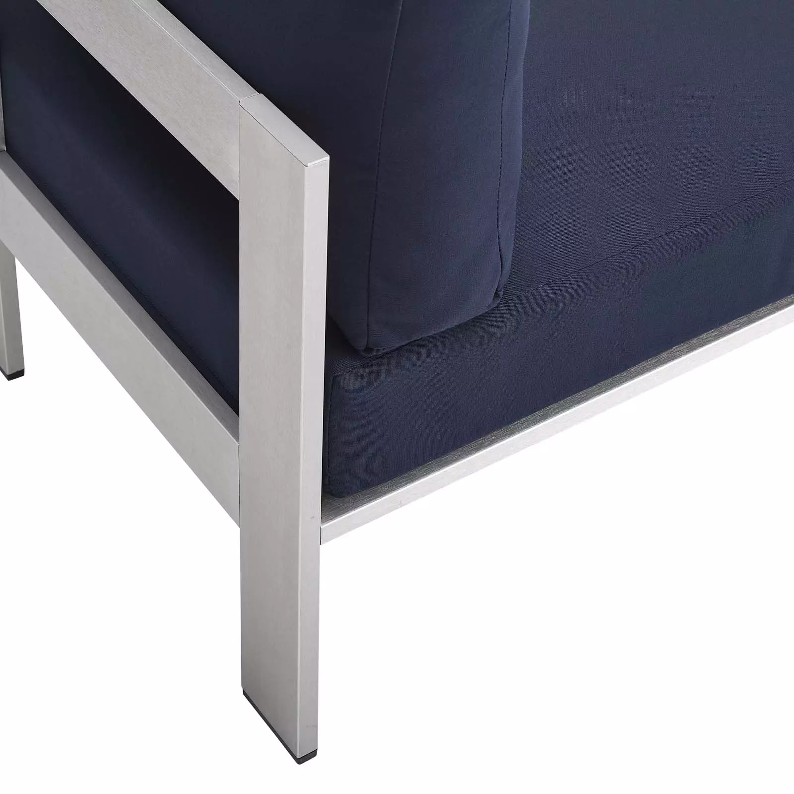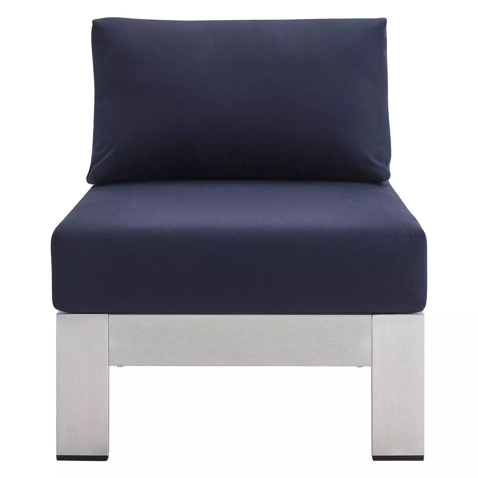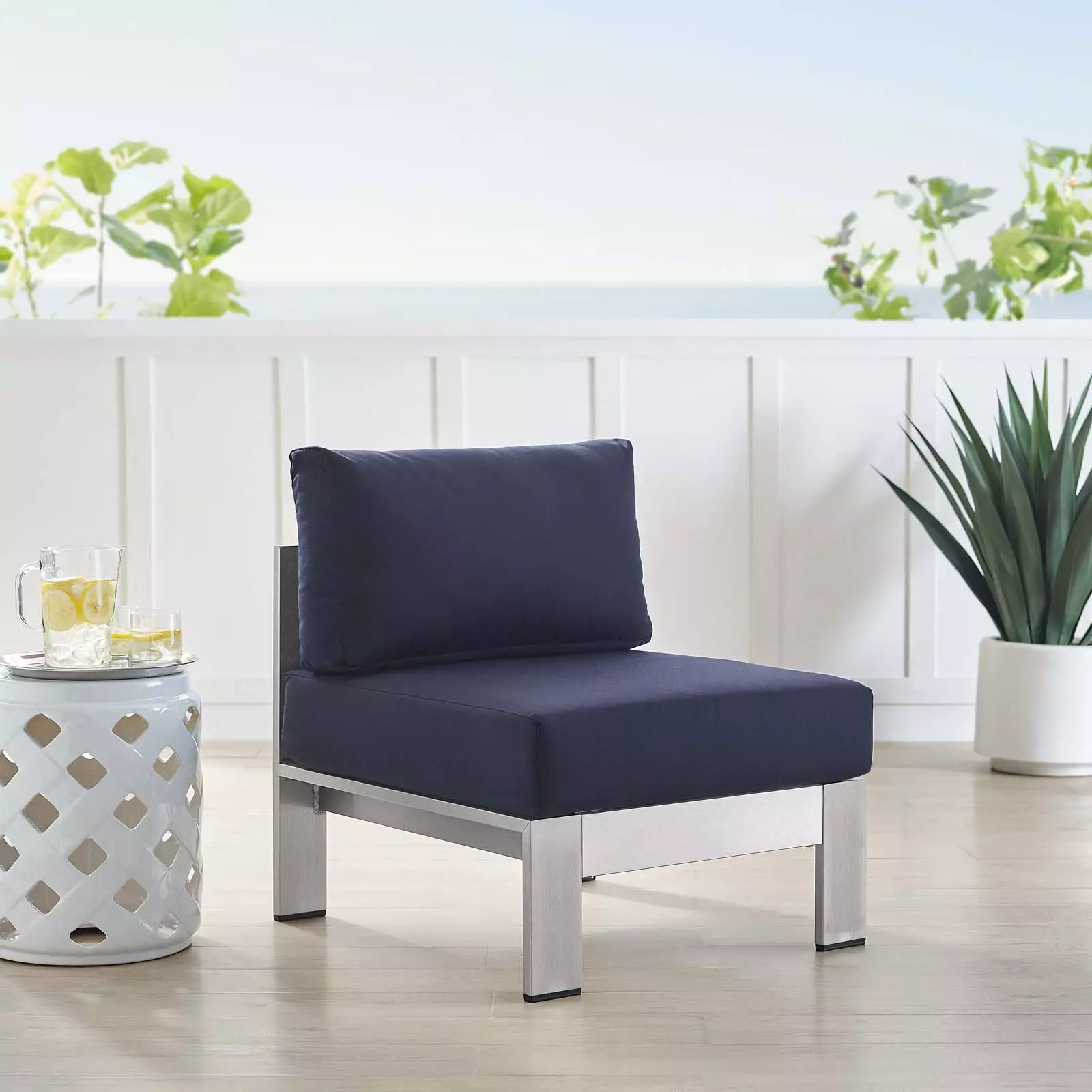 Enjoy your patio or backyard leisure time with the strong and durable Shore Outdoor Aluminum Armless Chair. Made with an anodized brushed aluminum frame and non-marking black plastic foot caps, Shore comes outfitted with resilient Sunbrella® fabric canvas cushions tested to last through all weather conditions. The Shore Outdoor Aluminum Armless Chair complements your casual gatherings with a look and functionality you can rely on. Set Includes: One - Shore Sunbrella® Fabric Aluminum Armless Chair