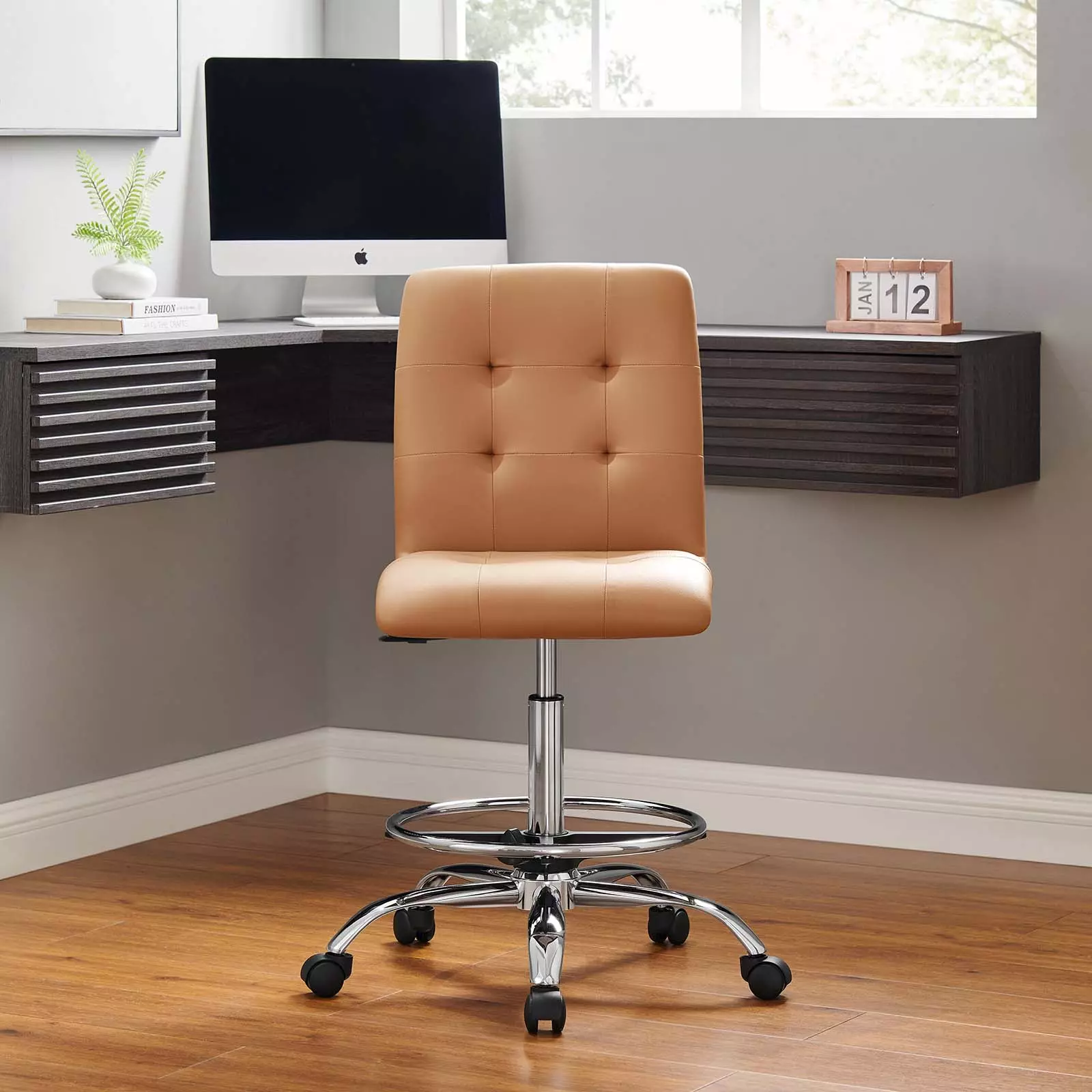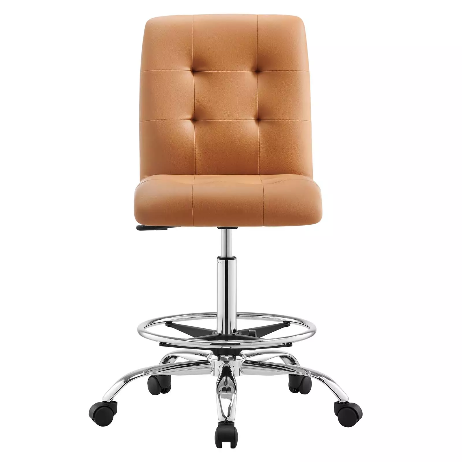 Modern and luxurious, this swivel drafting stool features deep biscuit tufting, durable vegan leather upholstery, and elegant piped trim for added finesse. This vegan leather drafting chair is height adjustable, features a 360º swivel, and comes outfitted with a chrome metal base with five dual-wheel nylon casters.