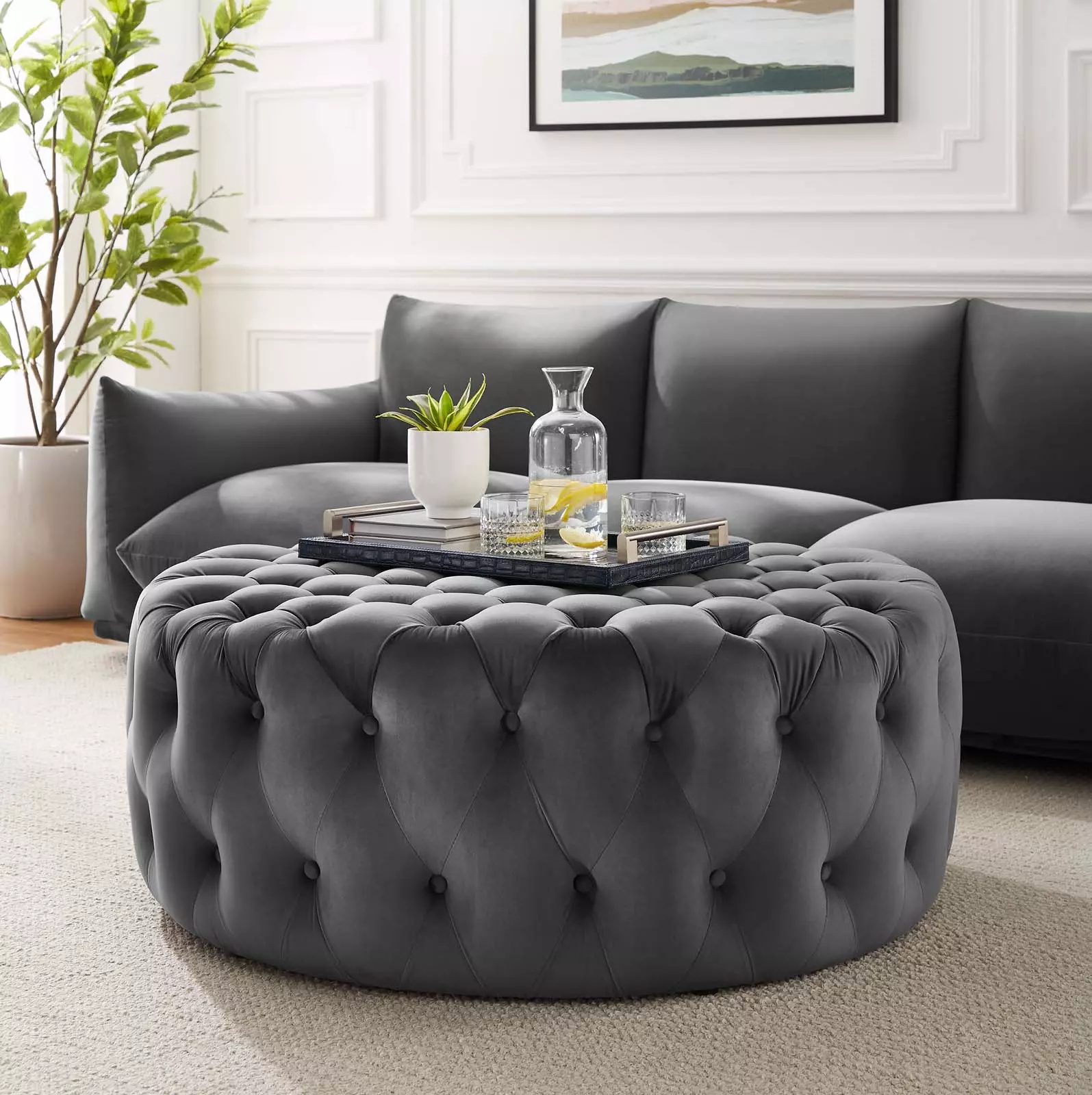 Enliven your decor with Amour. This large button tufted round ottoman comes upholstered in soft and durable stain-resistant performance velvet fabric with dense foam padding for a luxurious seating experience. A versatile piece of furniture, instantly update your living room, bedroom, or entryway with this glamorous accent piece. Amour delivers an extra living room seat, a place to kick your feet up, or a convenient surface for magazines and other leisure items.
