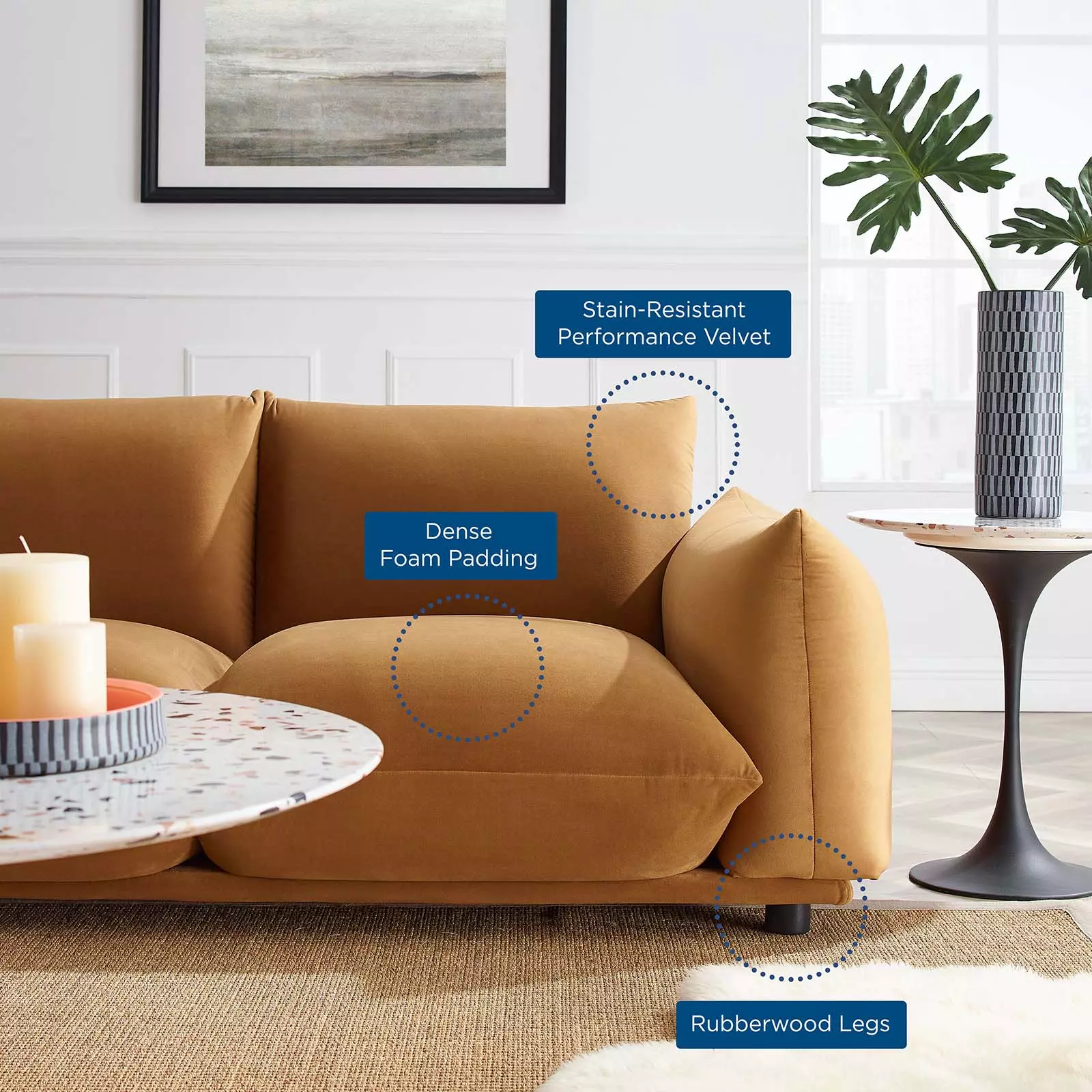 Sink into pillowy plush comfort with the Copious Performance Velvet Sofa. Featuring an overstuffed design, this sofa offers premium comfort with its plump cushions and soft, stain-resistant performance velvet upholstery. This cozy sofa is made for lounging and makes a bold statement in the living room, family room, or other lounge area. Resting atop rubberwood legs with non-marking foot caps, this sofa is crafted with dense foam padding and a solid wood and plywood frame for lasting durability.
