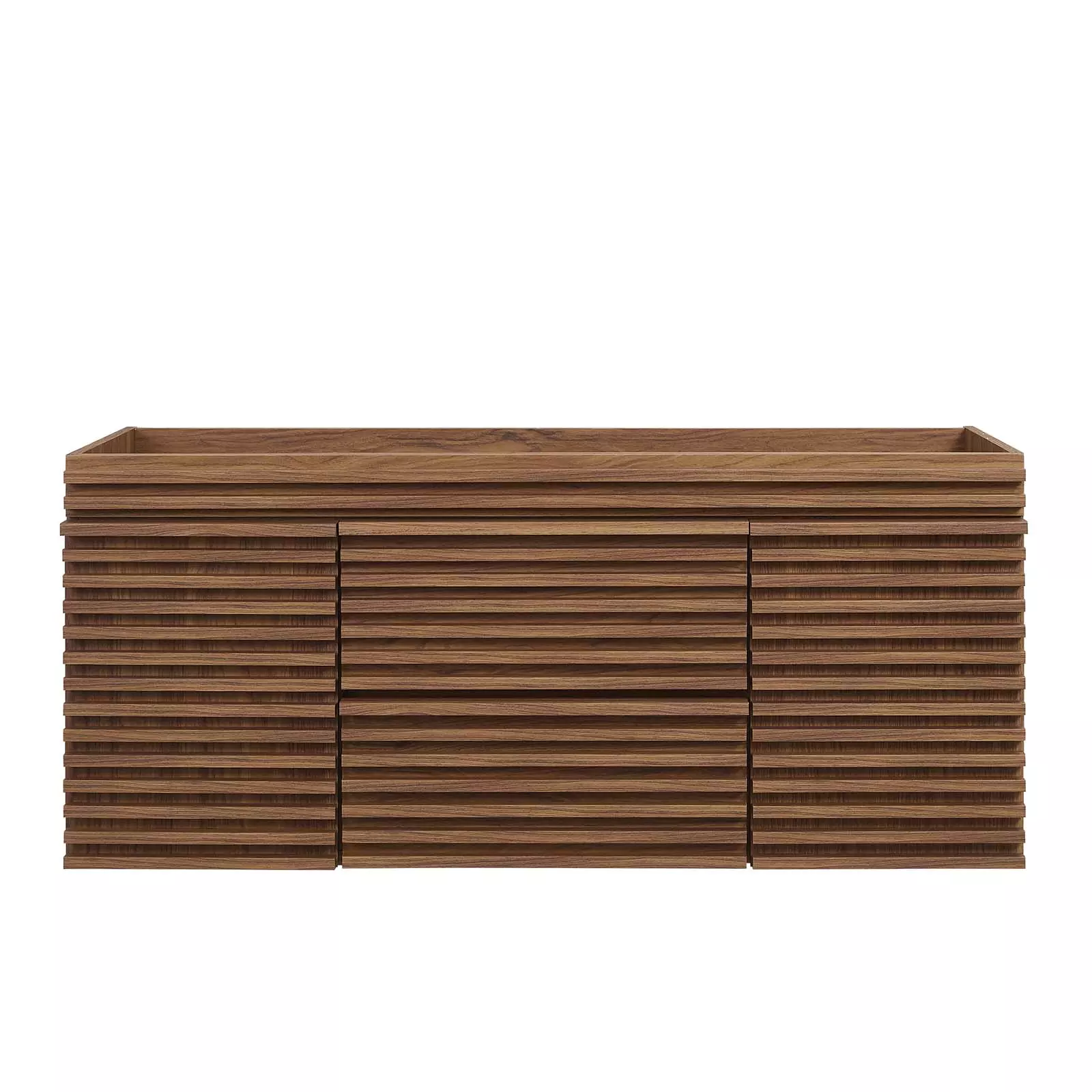 Tap into mid-century aesthetics with the Render Vanity Cabinet. The Render 48" Bathroom Vanity features a durable MDF and particleboard frame with a smooth laminate, ample storage space in two full-extension drawers, and space-saving wall-mount design with a drywall friendly mounting cleat. Clean lines and crisp design align for an edgy style designed to meet your needs. Boasting a mid-century modern style this vanity features a solid construction with a pleasing look and practical functionality.
