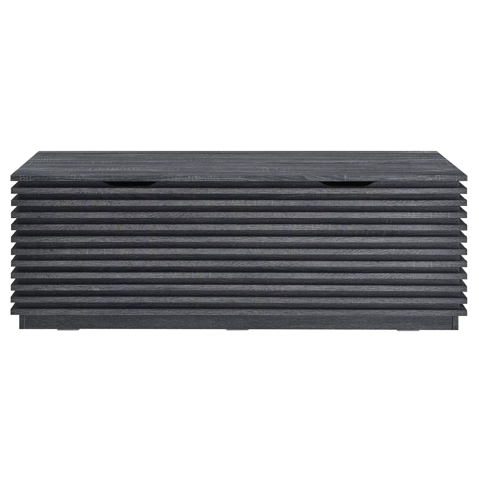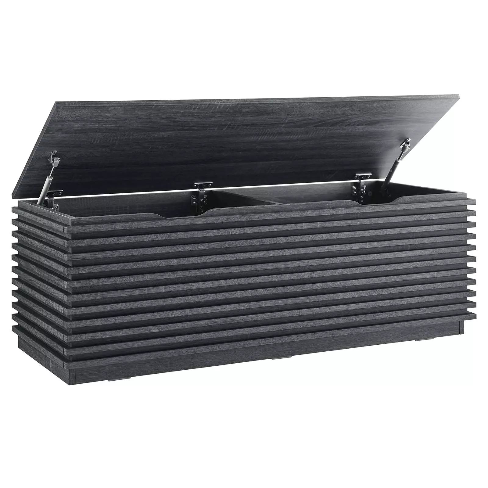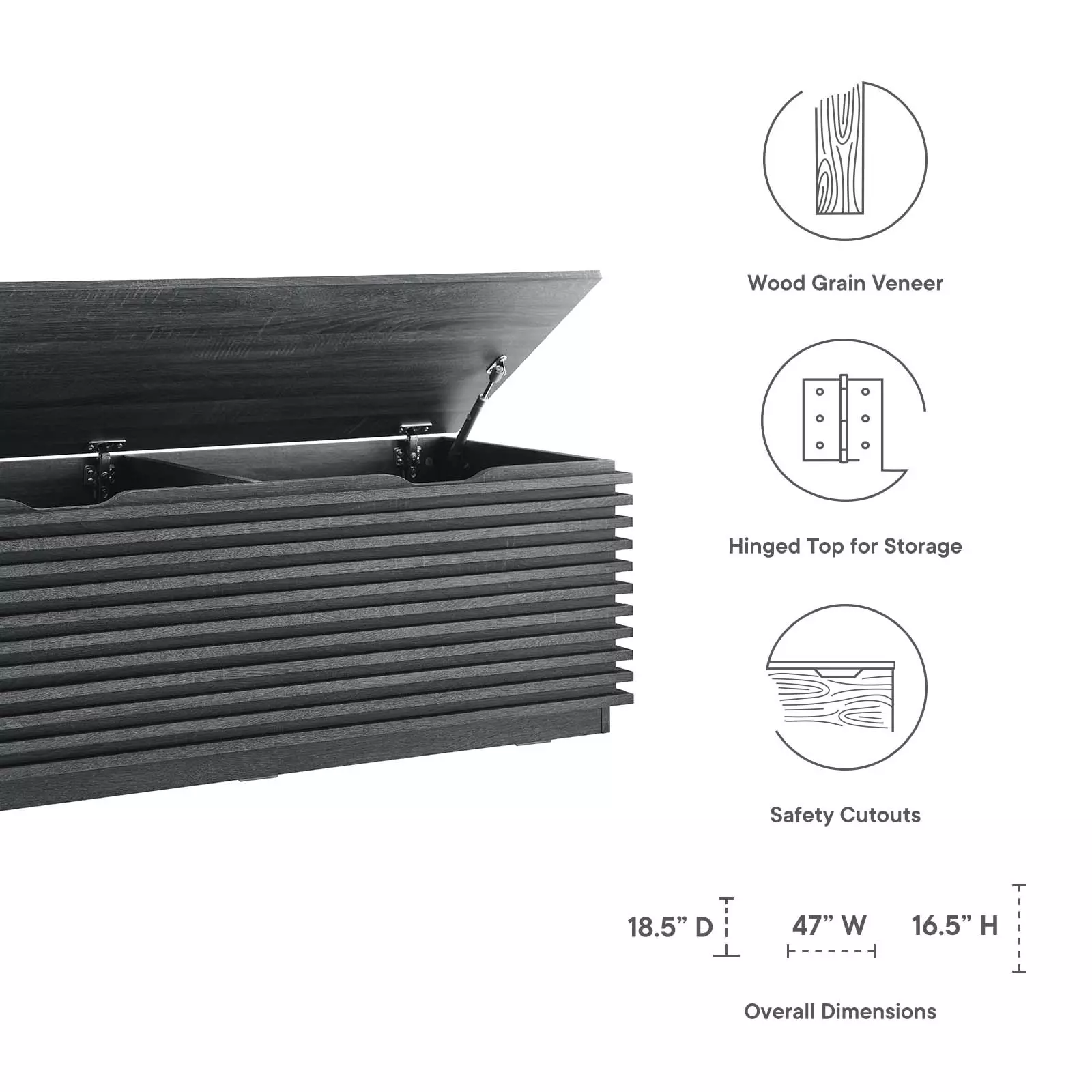 This installment of the Render collection features a durable particleboard frame with a smooth wood grain laminate and retro slatted detail. With a hinged top, this versatile accent bench features a solid construction with a pleasing look and practical functionality. Perfect for the living room, bedroom, entryway, or mudroom, this 47" bench offers ample storage space for linens, clothes, blankets, or whatever else suits your needs.