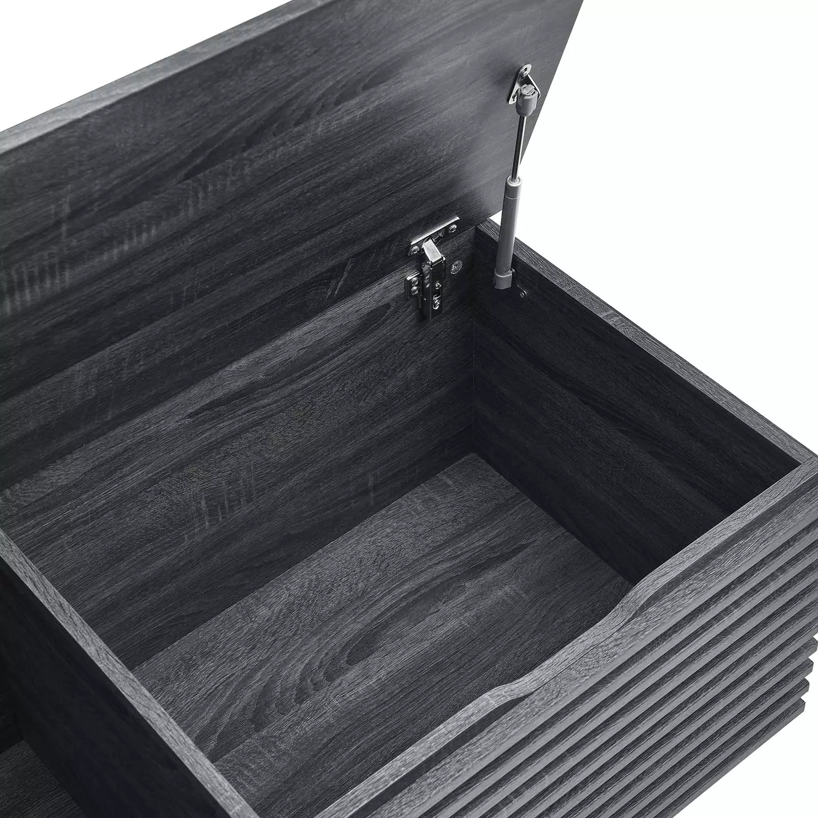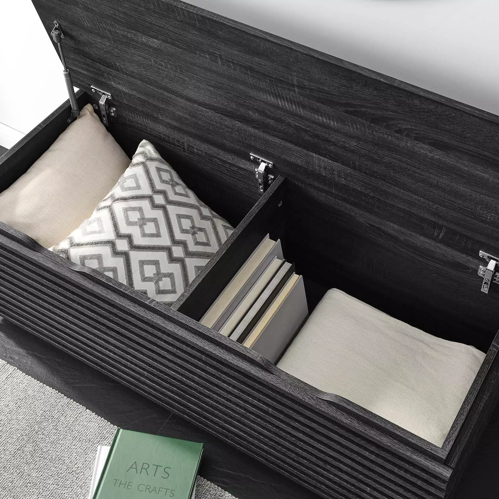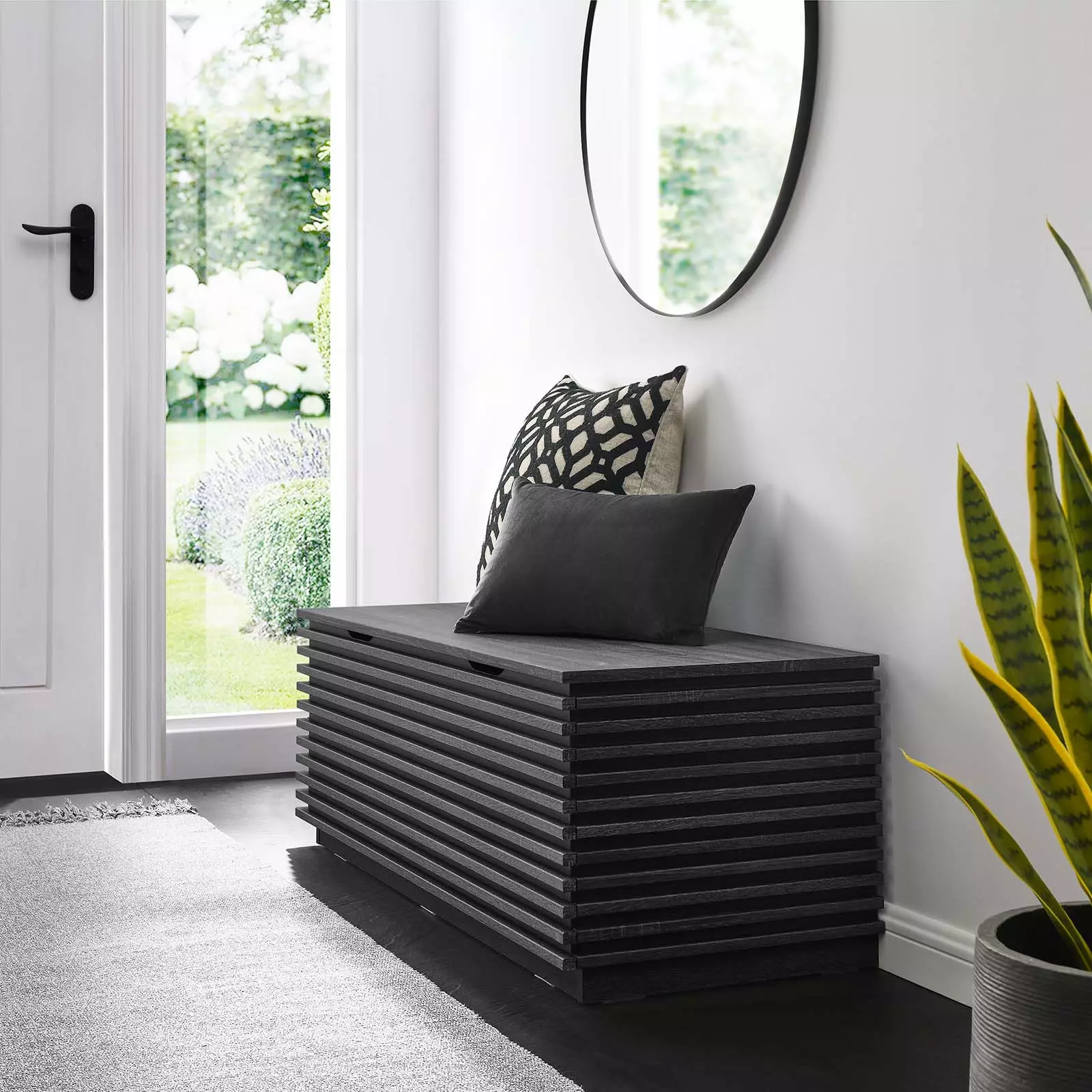 This installment of the Render collection features a durable particleboard frame with a smooth wood grain laminate and retro slatted detail. With a hinged top, this versatile accent bench features a solid construction with a pleasing look and practical functionality. Perfect for the living room, bedroom, entryway, or mudroom, this 47" bench offers ample storage space for linens, clothes, blankets, or whatever else suits your needs.
