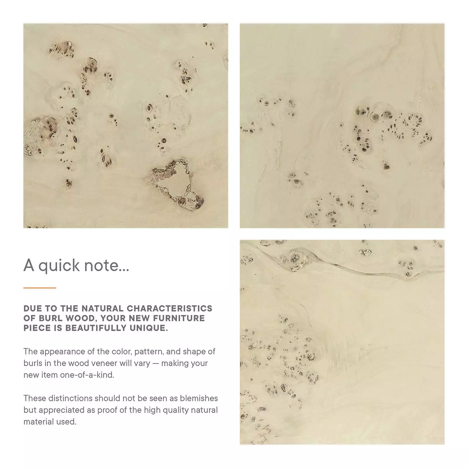 Constructed from MDF and mappa burl veneer, the Cosmos coffee table is a solid piece of furniture that captures the intricate beauty of real wood. The rich burl wood veneer, radiating a distinctive charm and character, makes every table unique. The clean lines and refined design bring a touch of sophistication to any space. With leveling, non-marking adjustable feet, your flooring will remain protected.