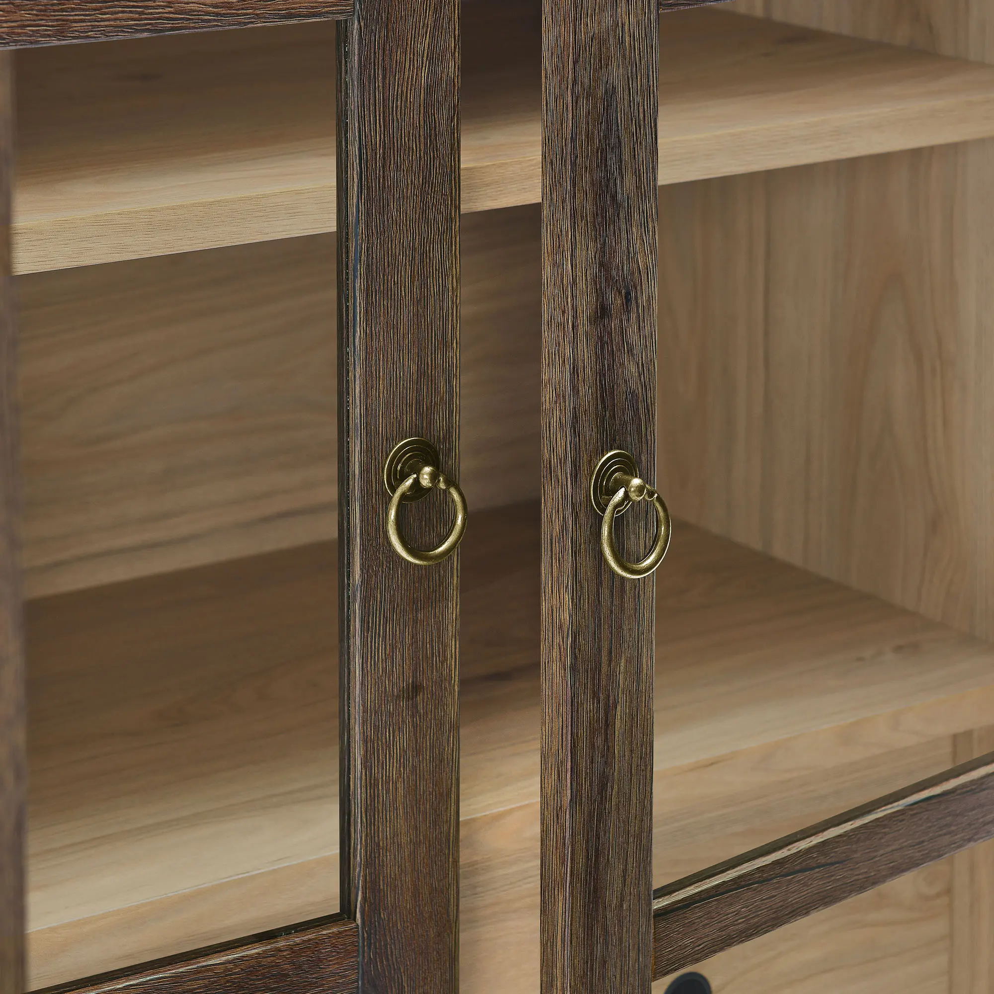 The Nolan Display Cabinet combines functional storage versatility with charming modern farmhouse style. Crafted from MDF and particleboard, the chic design flaunts wood grain laminate, edge trimming, and an elegantly rounded arched top shelf. Supported by tapered wood legs, the Nolan tall storage cabinet boasts two doors with tempered glass windows that provide an open view to its interior. Inside the arched cabinet you’ll find two adjustable shelves, a fixed shelf, and two roomy full-glide drawers, offering plenty of storage space for displaying decorative items or for tucking away odds and ends. Complete with soft-close hinges and metal ring pull handles with a brushed gold finish, this wood storage cabinet is as stylish as it is practical. Perfect for your living room, hallway, or dining area, this arched bookcase effortlessly adds an air of sophistication and vintage allure to your home. To protect your flooring, this tall storage cabinet with doors comes equipped with non-marking foot pads. Assembly required. Weight Capacity: Arched Shelf: 88 lbs, Adjustable Shelves: 70 lbs, Fixed Shelf: 62 lbs, Drawers: 22 lbs