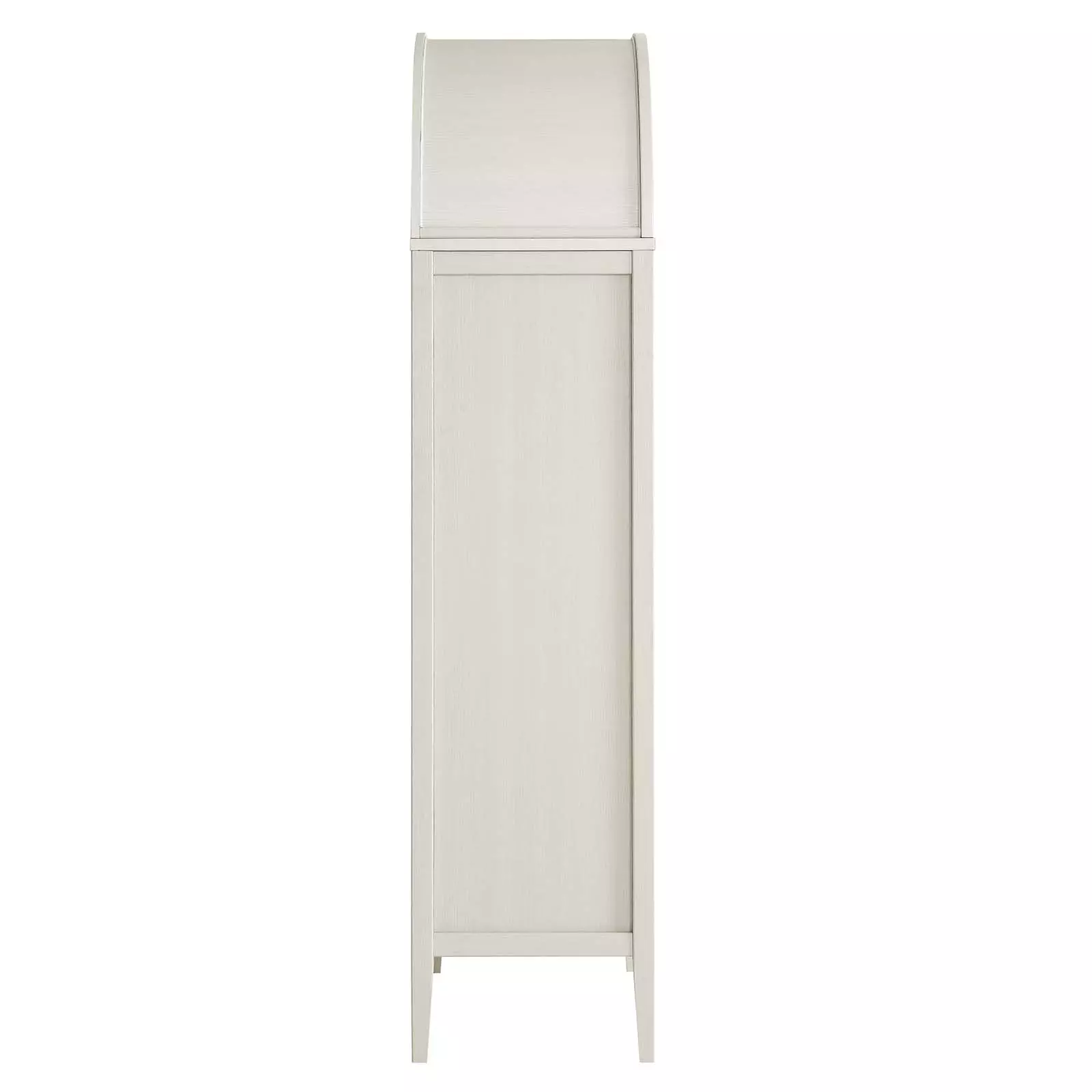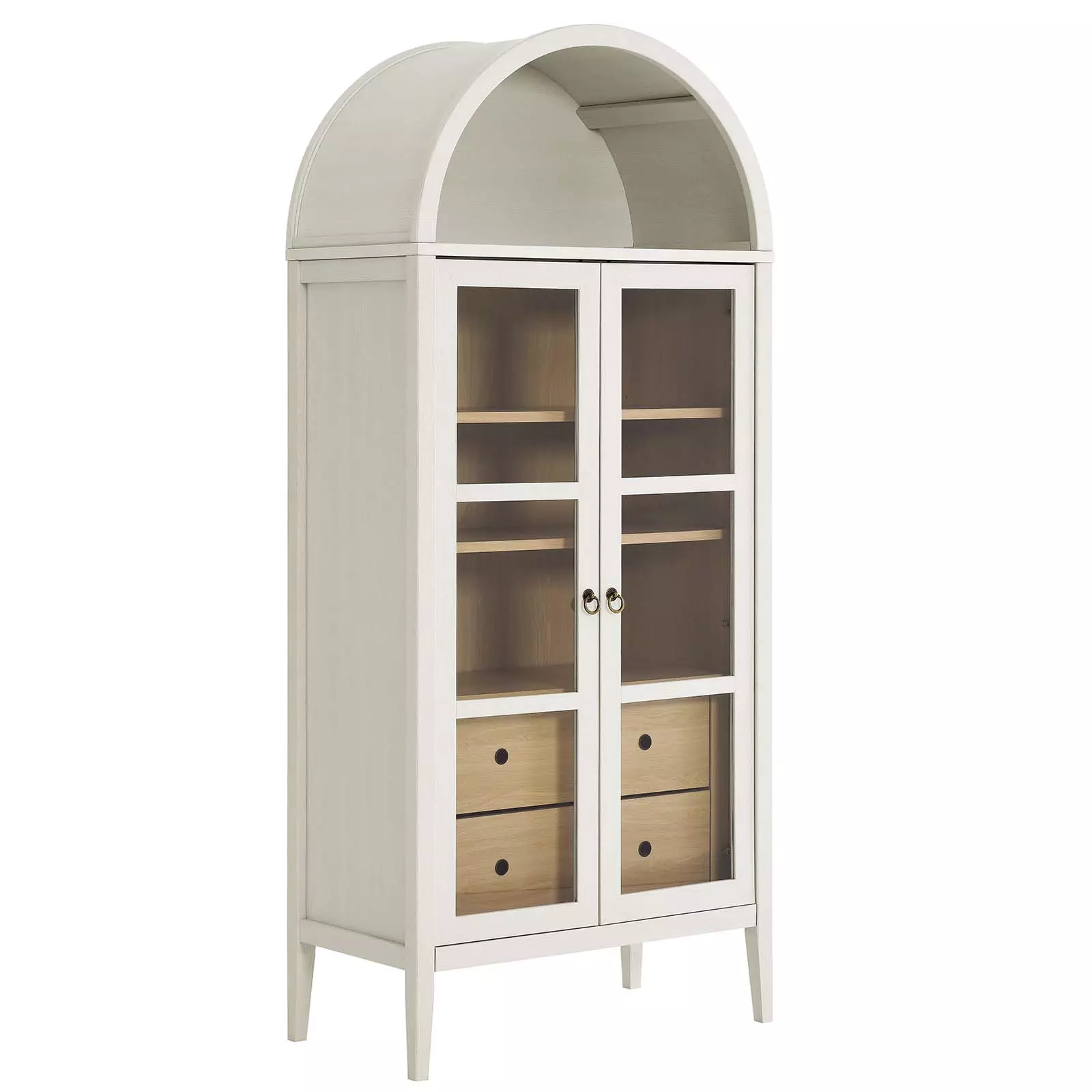 Crafted from MDF and particleboard, the chic design flaunts wood grain laminate, edge trimming, and an elegantly rounded arched top shelf. Supported by tapered wood legs, this display cabinet boasts two doors with tempered glass windows that provide an open view to its interior.