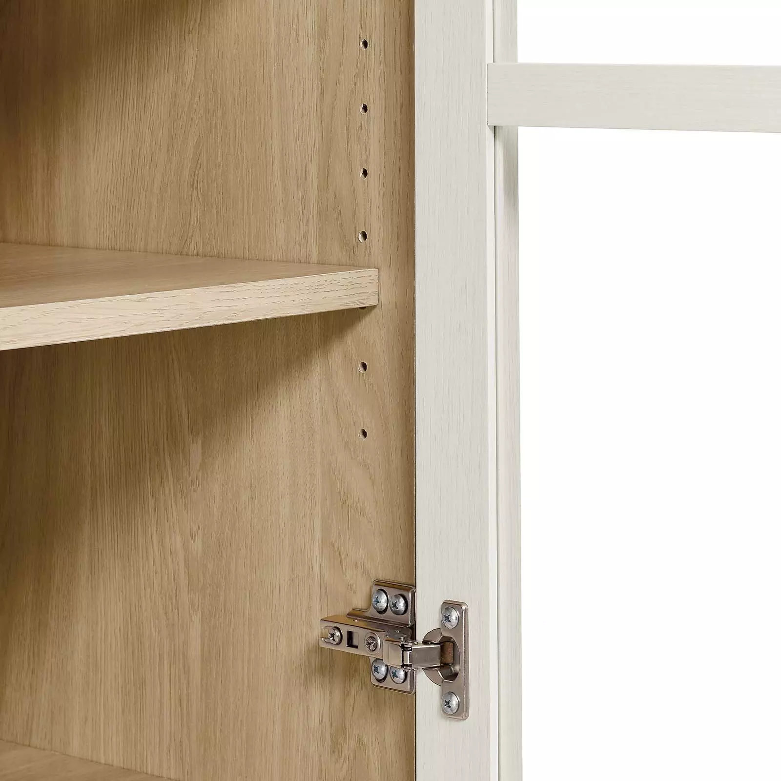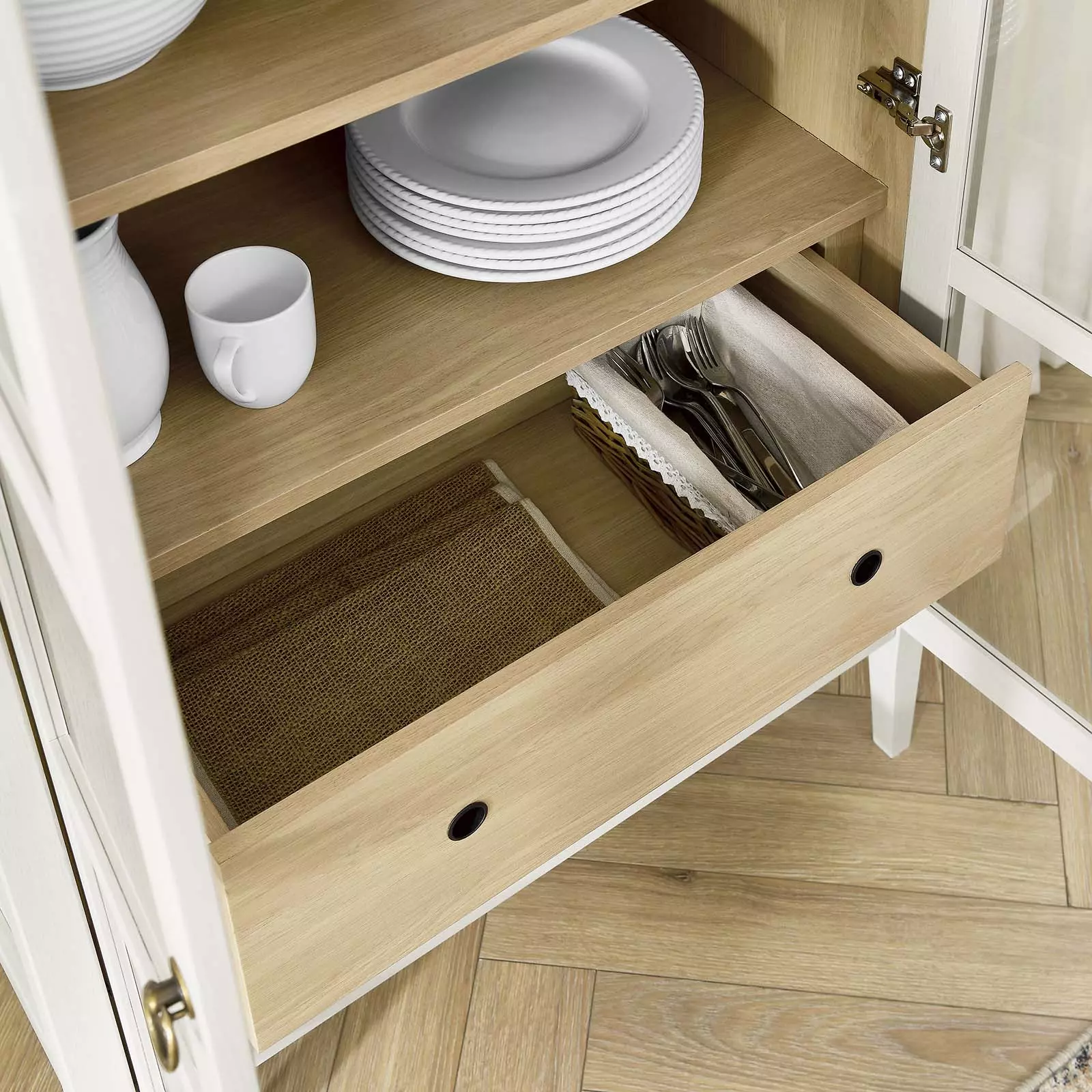 Inside the cabinet you’ll find two adjustable shelves, a fixed shelf, and two roomy full-glide drawers, offering plenty of storage space for displaying decorative items or for tucking away odds and ends. Complete with soft-close hinges and metal ring pull handles with a brushed gold finish, this wood cabinet is as stylish as it is practical.