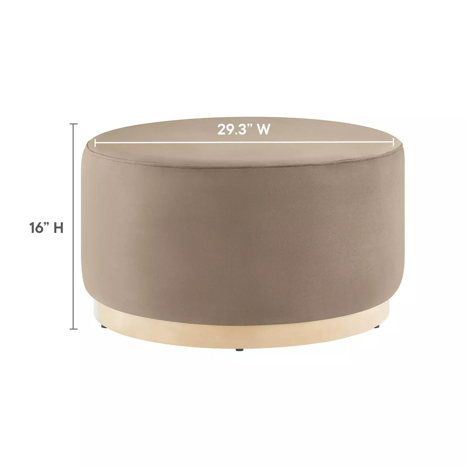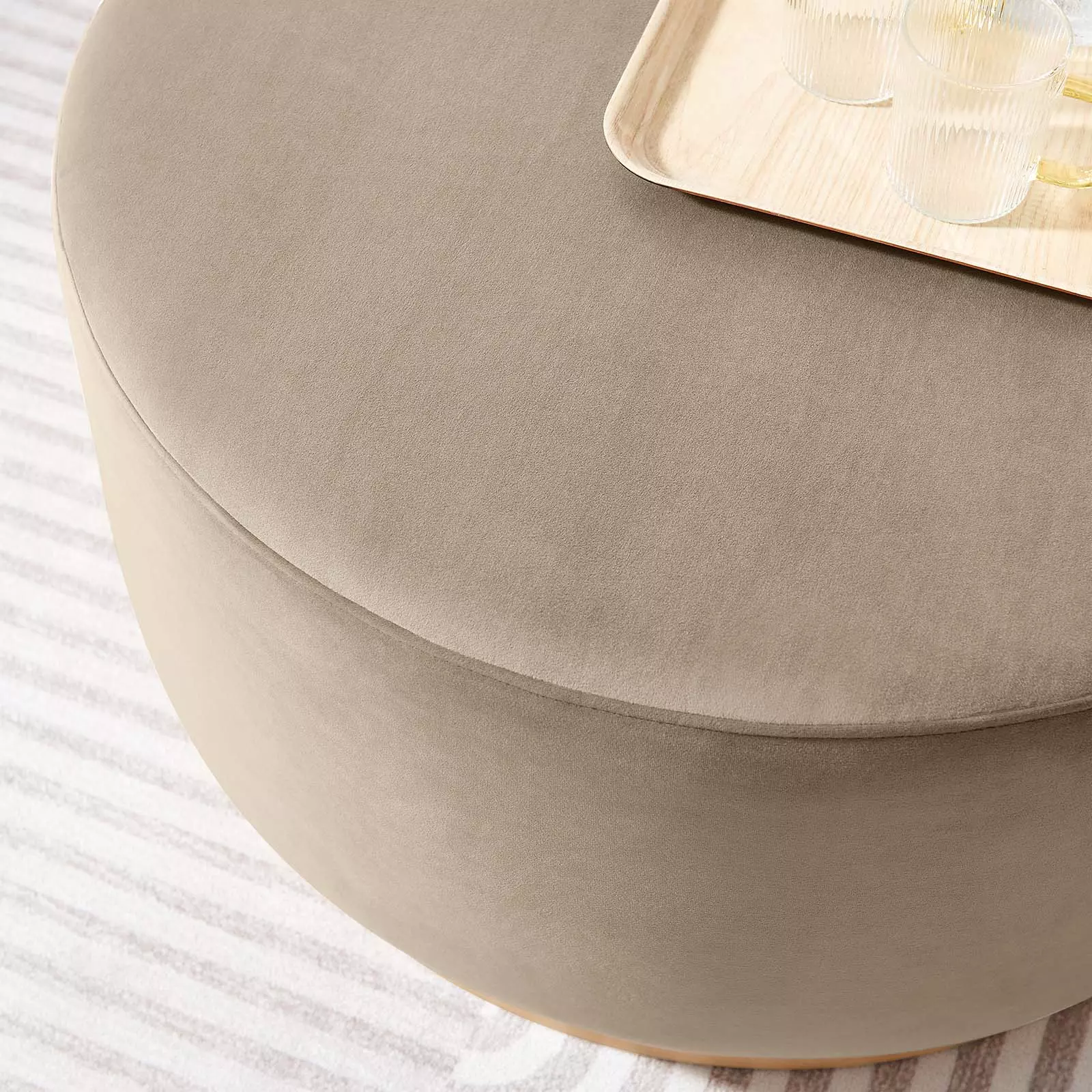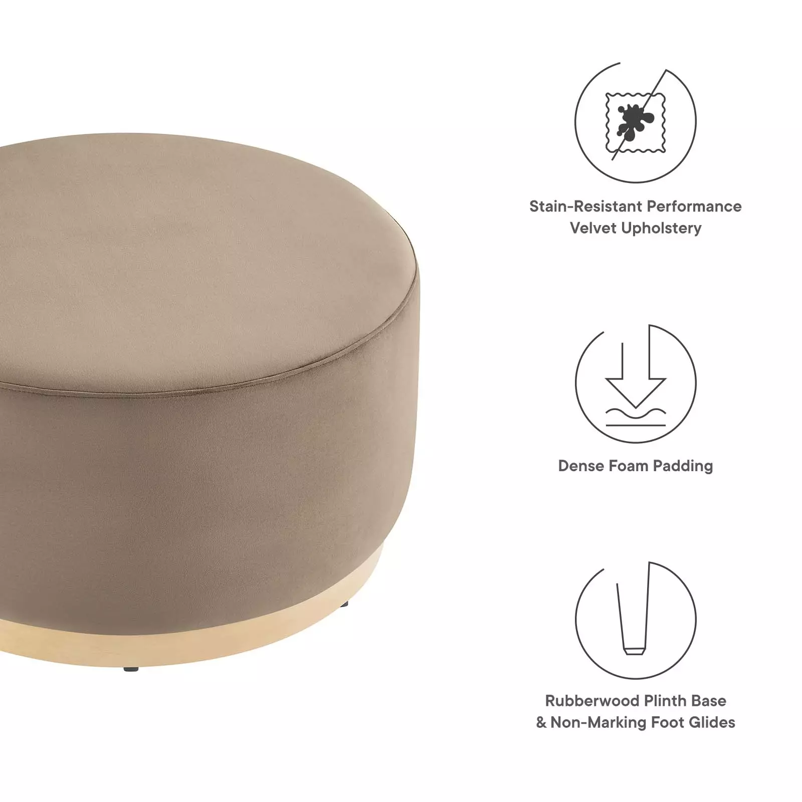 Delight in the elegance of the Tilden 29" Round Upholstered Ottoman, an ideal accent ottoman for modern homes, offices, or cozy apartments. Upholstered in stain-resistant performance velvet with French piping trim, this large ottoman footstool offers both luxury and durability. Its tailored silhouette complements contemporary decor, while the dense foam padding provides versatile use as a comfortable ottoman seat, large footrest, or living room ottoman coffee table. Resting on a rubberwood plinth base with non-marking glides, this ottoman table protects your floors from damage. Arriving fully assembled, the Tilden performance velvet ottoman combines chic style and functionality. Weight Capacity: 506 lbs. Set Includes: One - Tilden Large 29" Round Performance Velvet Upholstered Ottoman