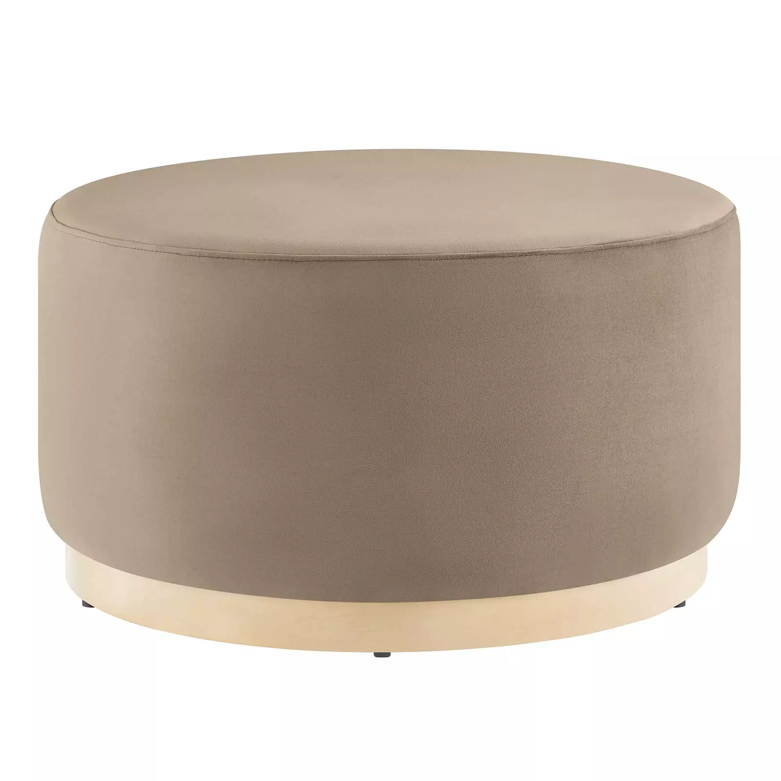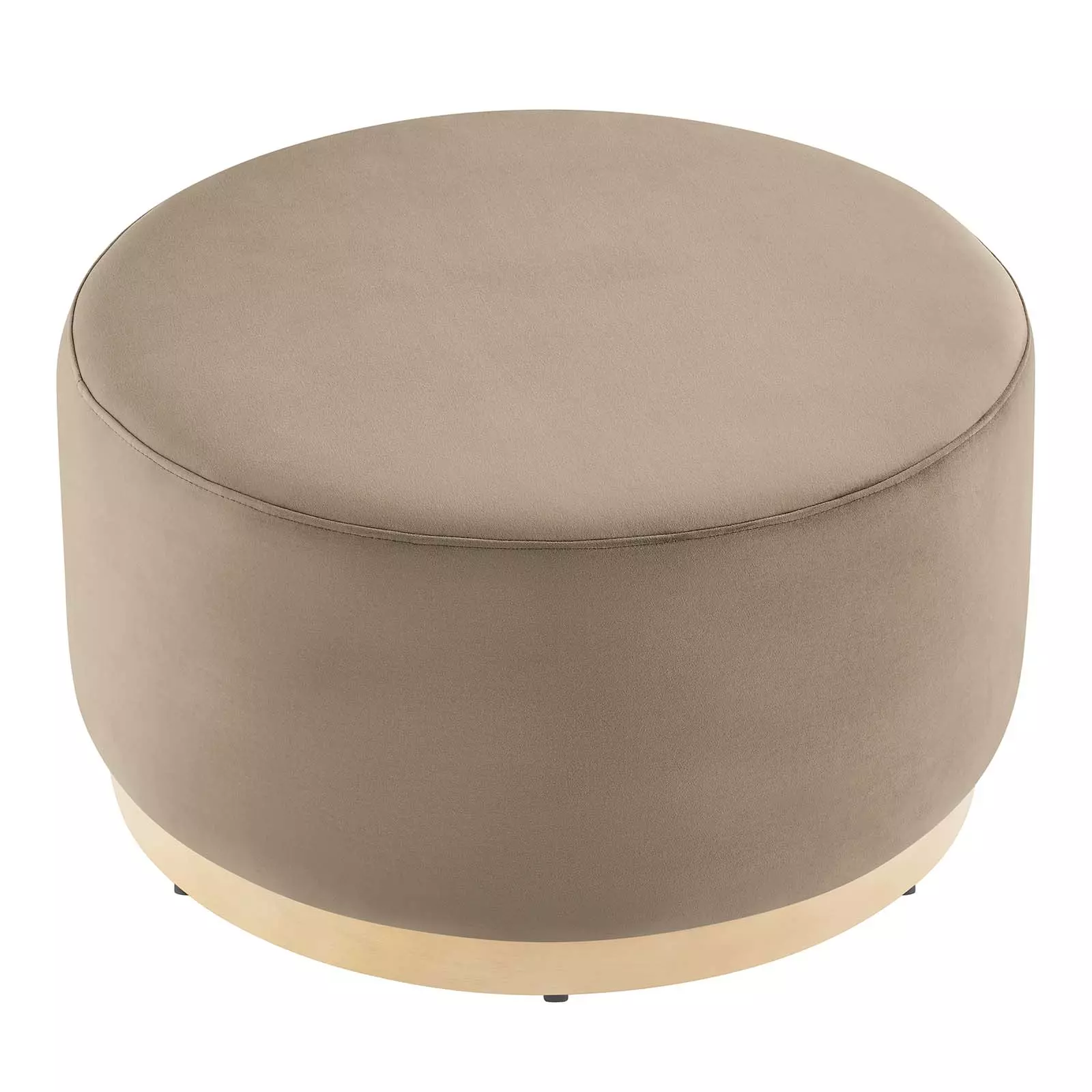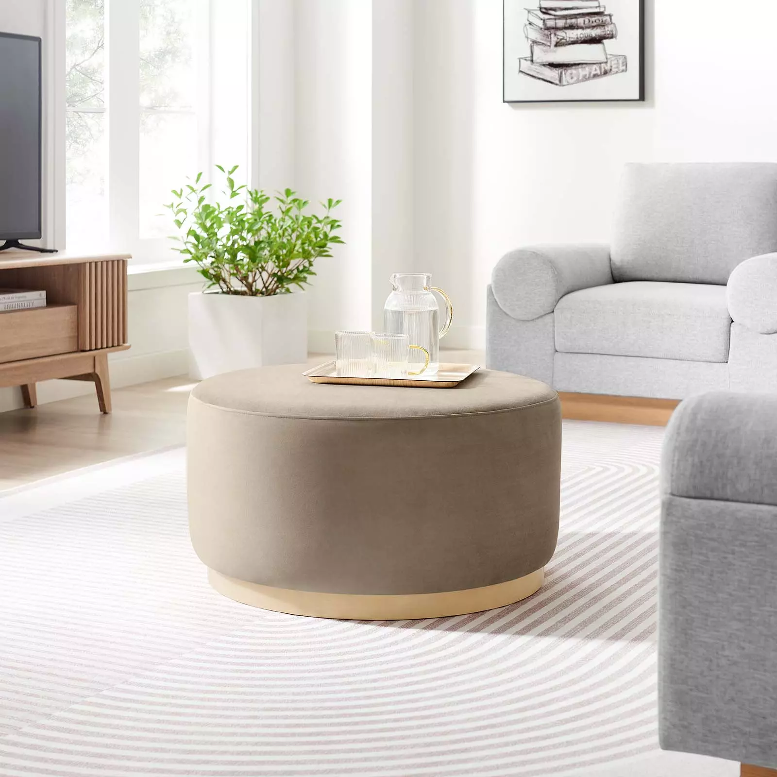 Delight in the elegance of the Tilden 29" Round Upholstered Ottoman, an ideal accent ottoman for modern homes, offices, or cozy apartments. Upholstered in stain-resistant performance velvet with French piping trim, this large ottoman footstool offers both luxury and durability. Its tailored silhouette complements contemporary decor, while the dense foam padding provides versatile use as a comfortable ottoman seat, large footrest, or living room ottoman coffee table. Resting on a rubberwood plinth base with non-marking glides, this ottoman table protects your floors from damage. Arriving fully assembled, the Tilden performance velvet ottoman combines chic style and functionality. Weight Capacity: 506 lbs. Set Includes: One - Tilden Large 29" Round Performance Velvet Upholstered Ottoman