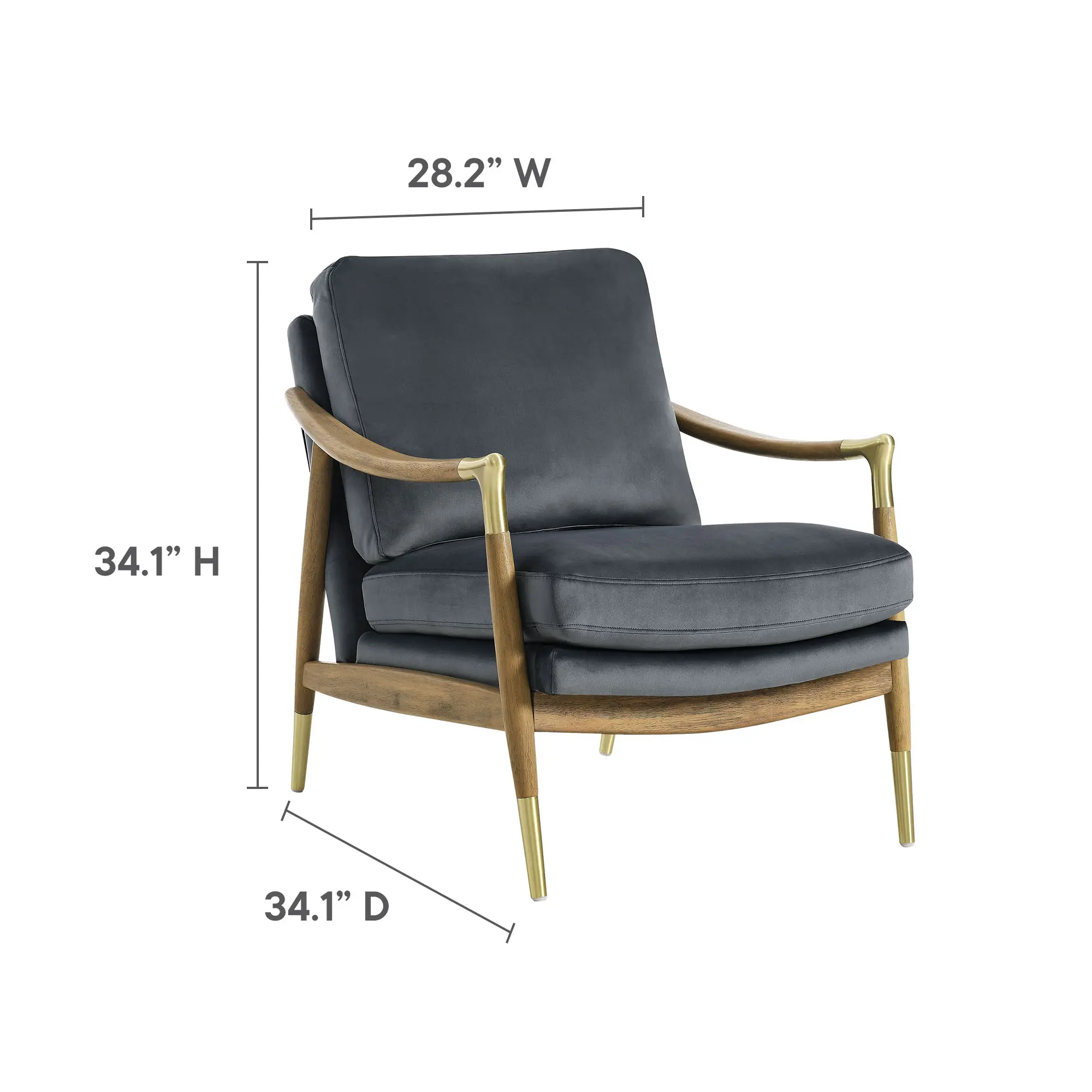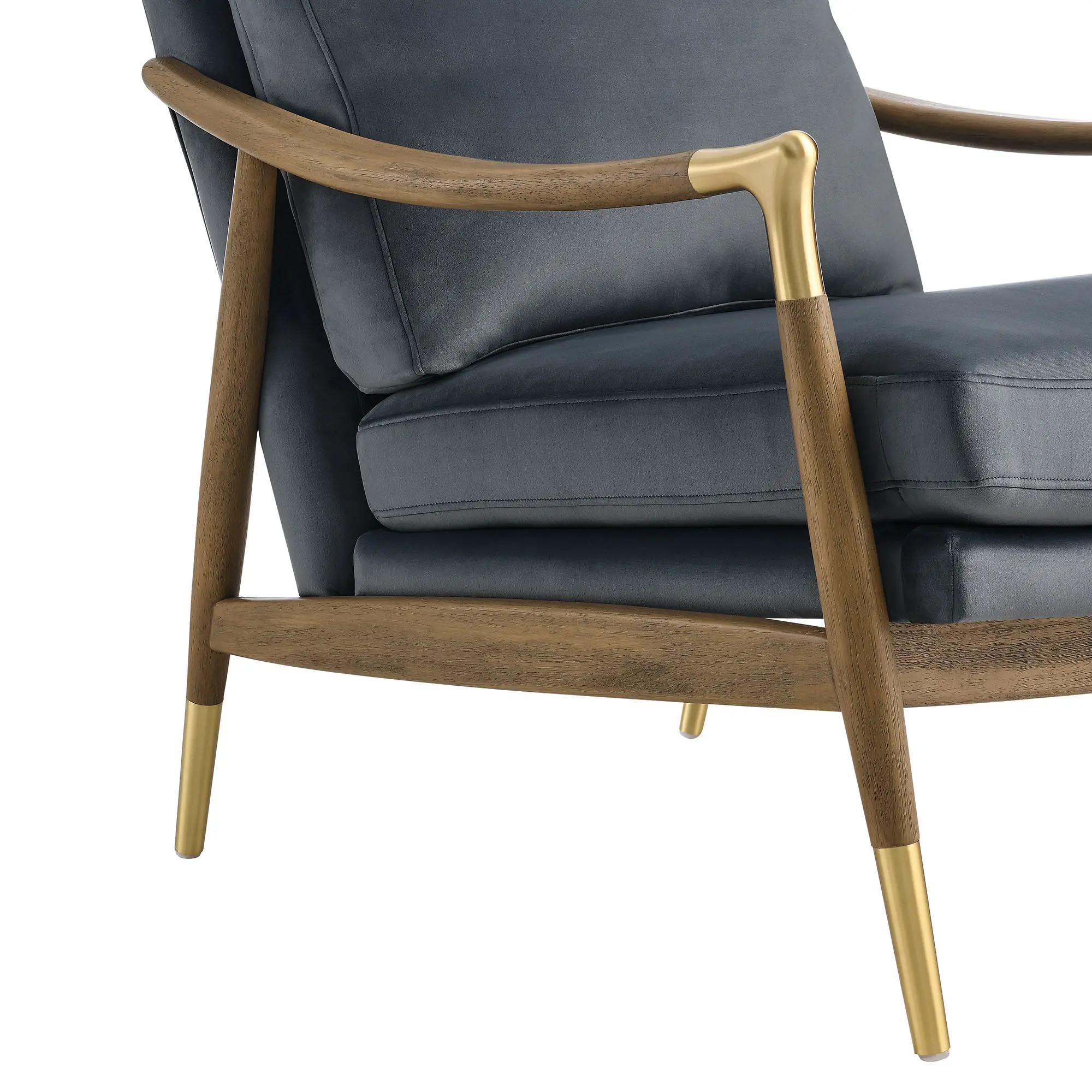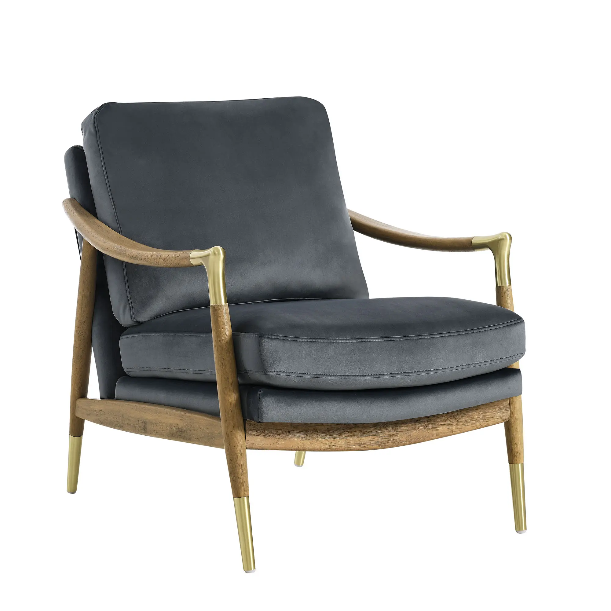 Enhance your living space with the Langford Performance Velvet Living Room Chair, where elegance meets comfort in a timeless mid-century modern design. Upholstered in stain-resistant performance velvet, this accent chair adds a sophisticated touch with its inviting, plush texture and resilient finish. Brass accents on the legs and corners of the swooped armrests bring a refined charm, highlighting the velvet chair’s clean lines and classic structure. Crafted with a solid kiln-dried wood frame, this accent chair with arms is as durable as it is stylish, offering long-lasting support and comfort. Langford's cushions provide a consistent look and feel, ensuring this modern armchair remains as cozy as it is chic. Perfect for reading nooks, living rooms, or as a striking bedroom accent, the Langford Reading Nook Chair combines mid-century modern flair with modern functionality. Assembly required, with clear instructions provided for an easy setup. Weight Capacity: 300 lbs.