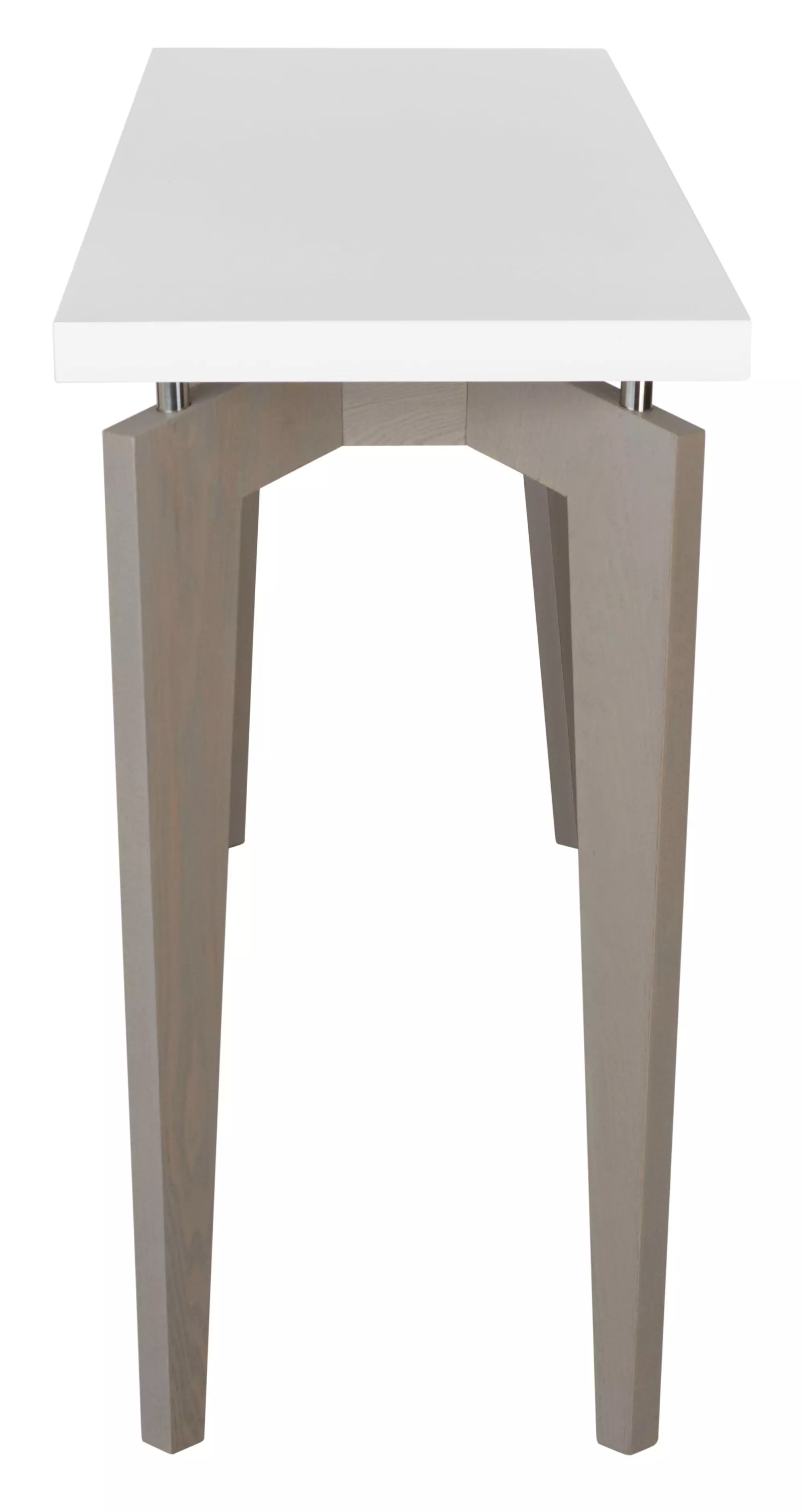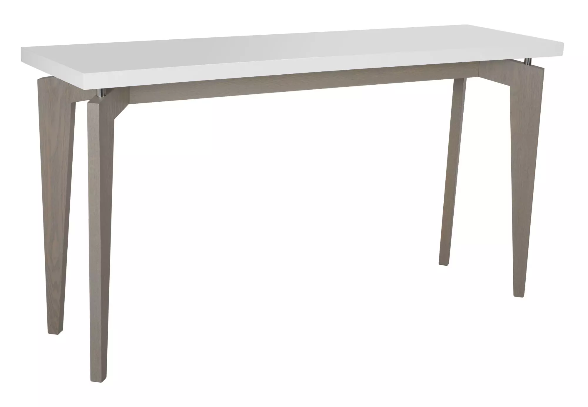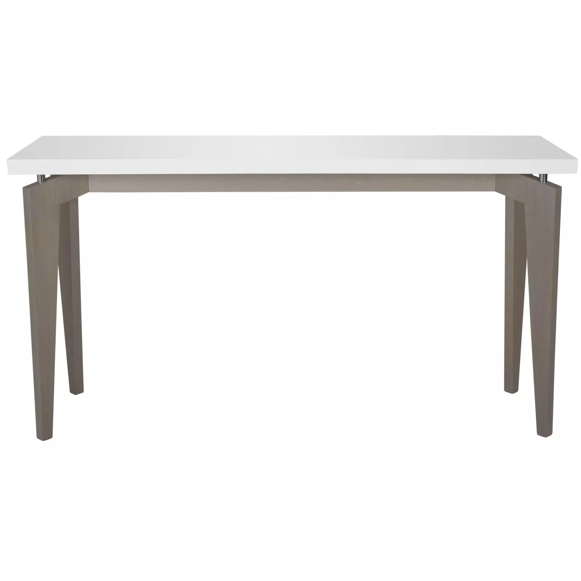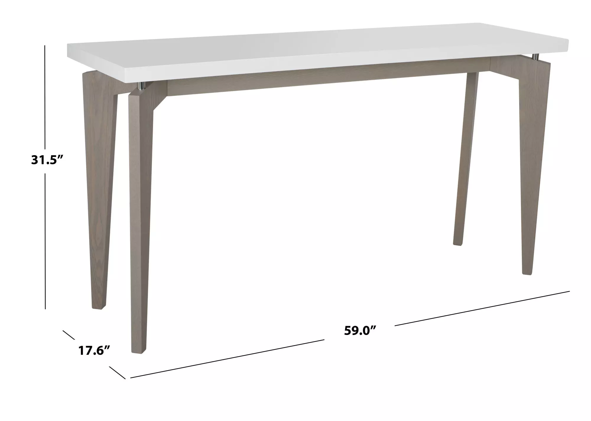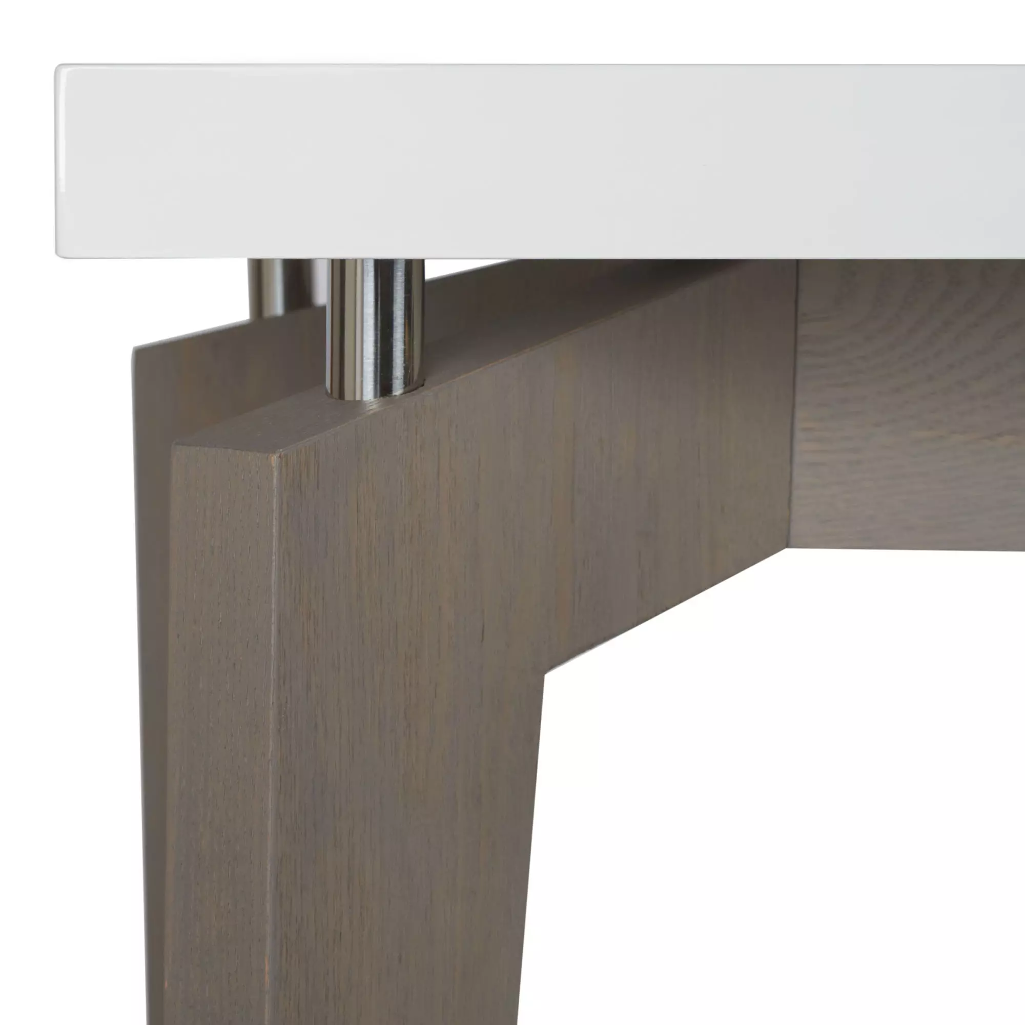 Urban yet refined, the Joseph console floats a shiny white lacquer top resting on thick metal posts to a base with grey washed wood-grained legs. Graphic and sleek, this console table is a canvas for interesting displays of collectibles, books and more.Dust regularly with a soft, dry cloth. Never use oiled or treated cloths on lacquered finishes. Some finishes can be wiped with a damp (not wet) cloth, followed at once by rubbing with a dry cloth to remove fingerprints and smudges. For persistent spots, gently clean with a soft cloth and a solution of water and mild soap, make sure to wipe dry. Use adhesive felt pads, coasters and placemats to protect your furniture.