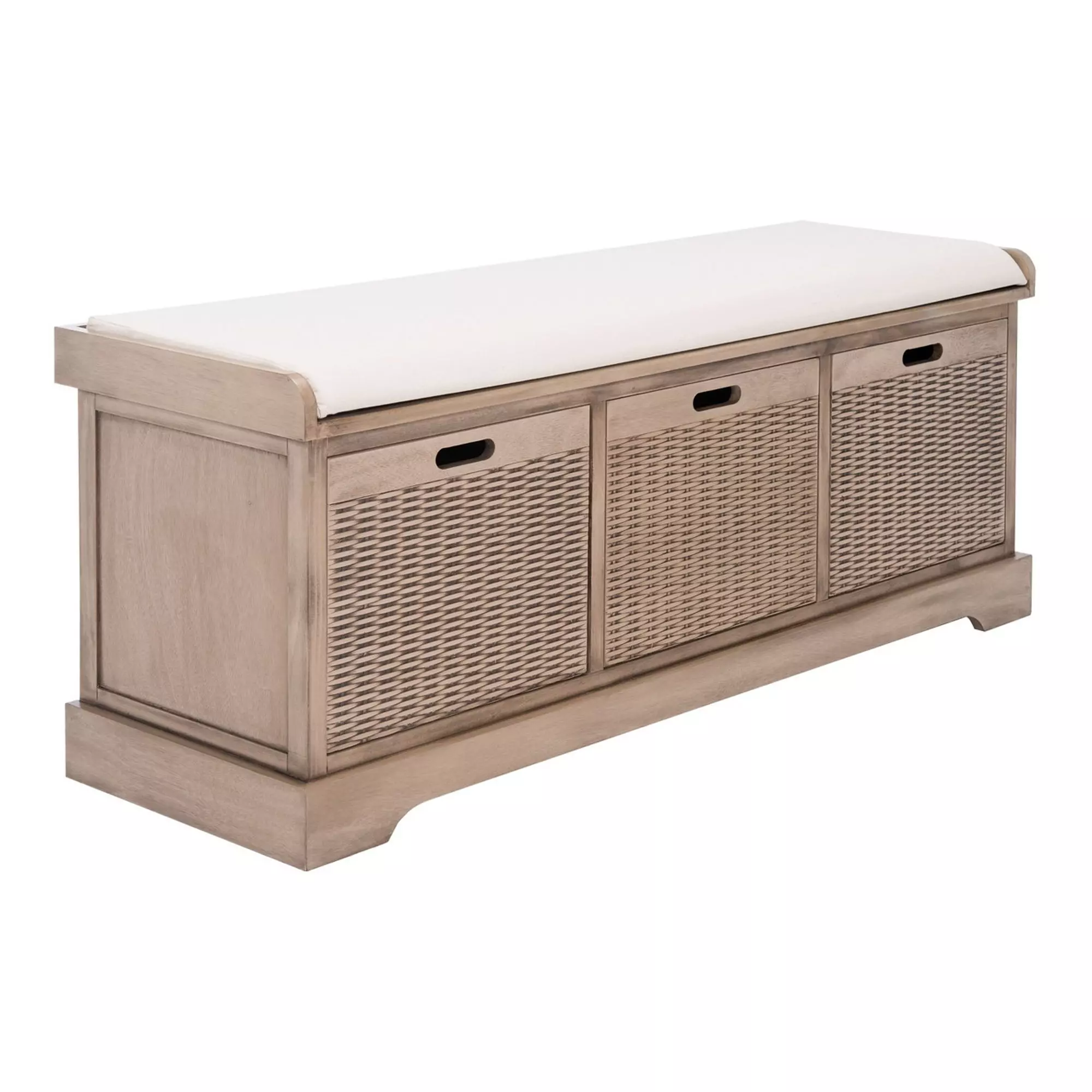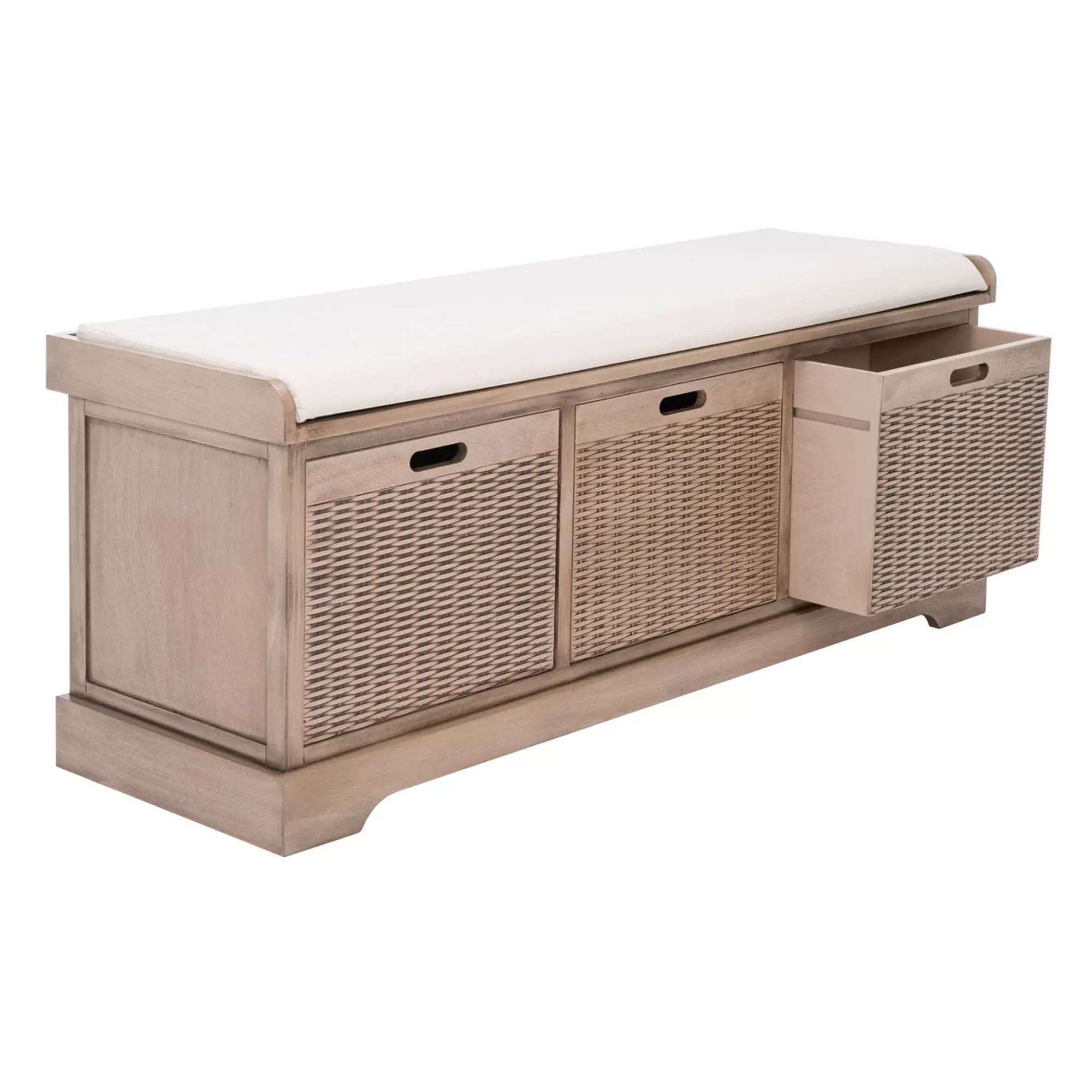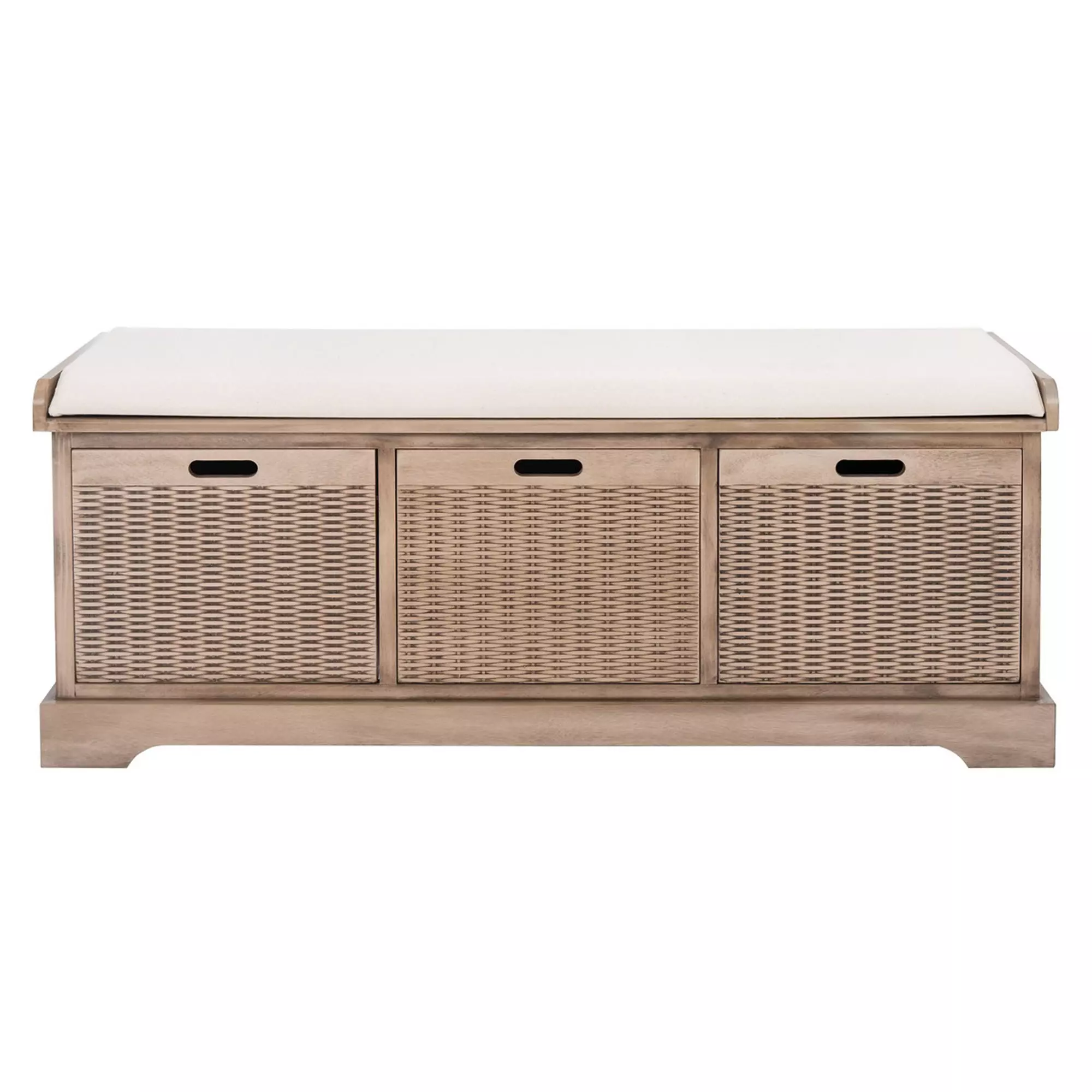 This Landers Cushion Storage Bench performs double duty as a stylish storage solution and perfect seating in an entryway or mud room. Landers gives your décor a touch of contemporary farmhouse charm with its soft sand finish and three spacious basket drawers.