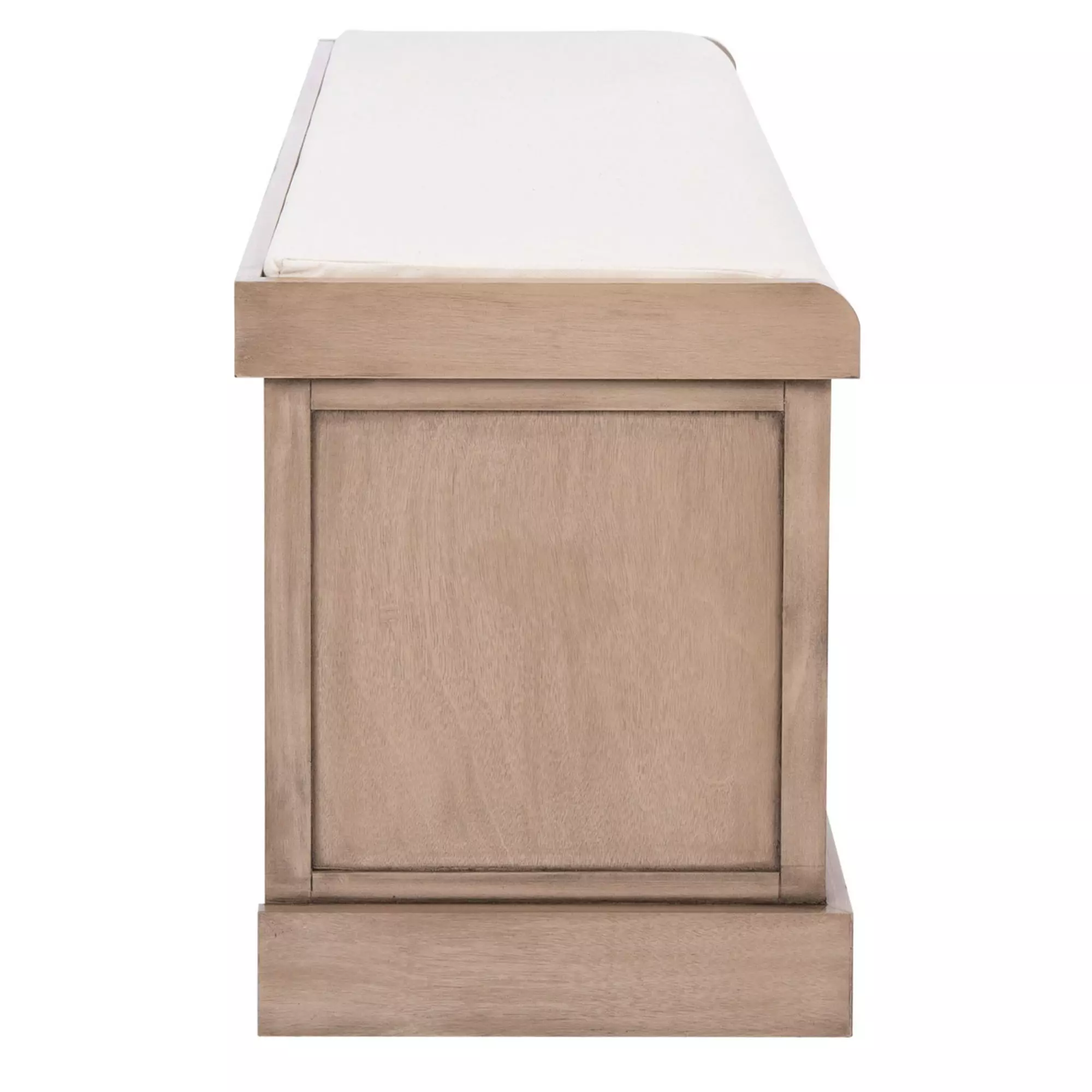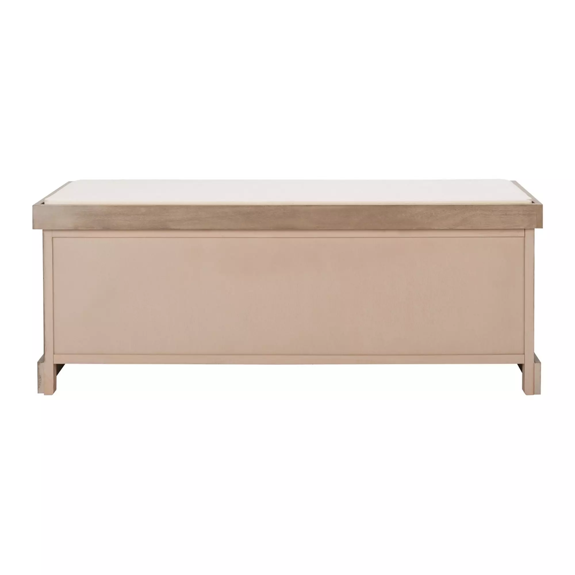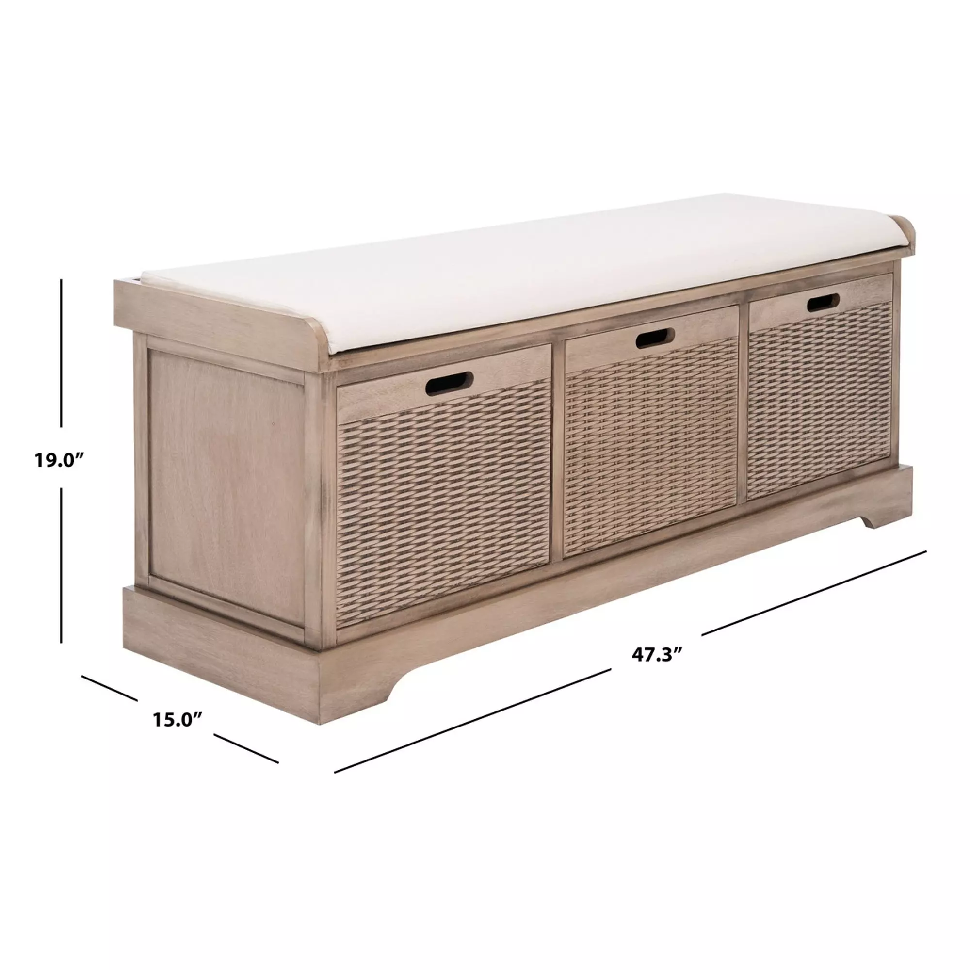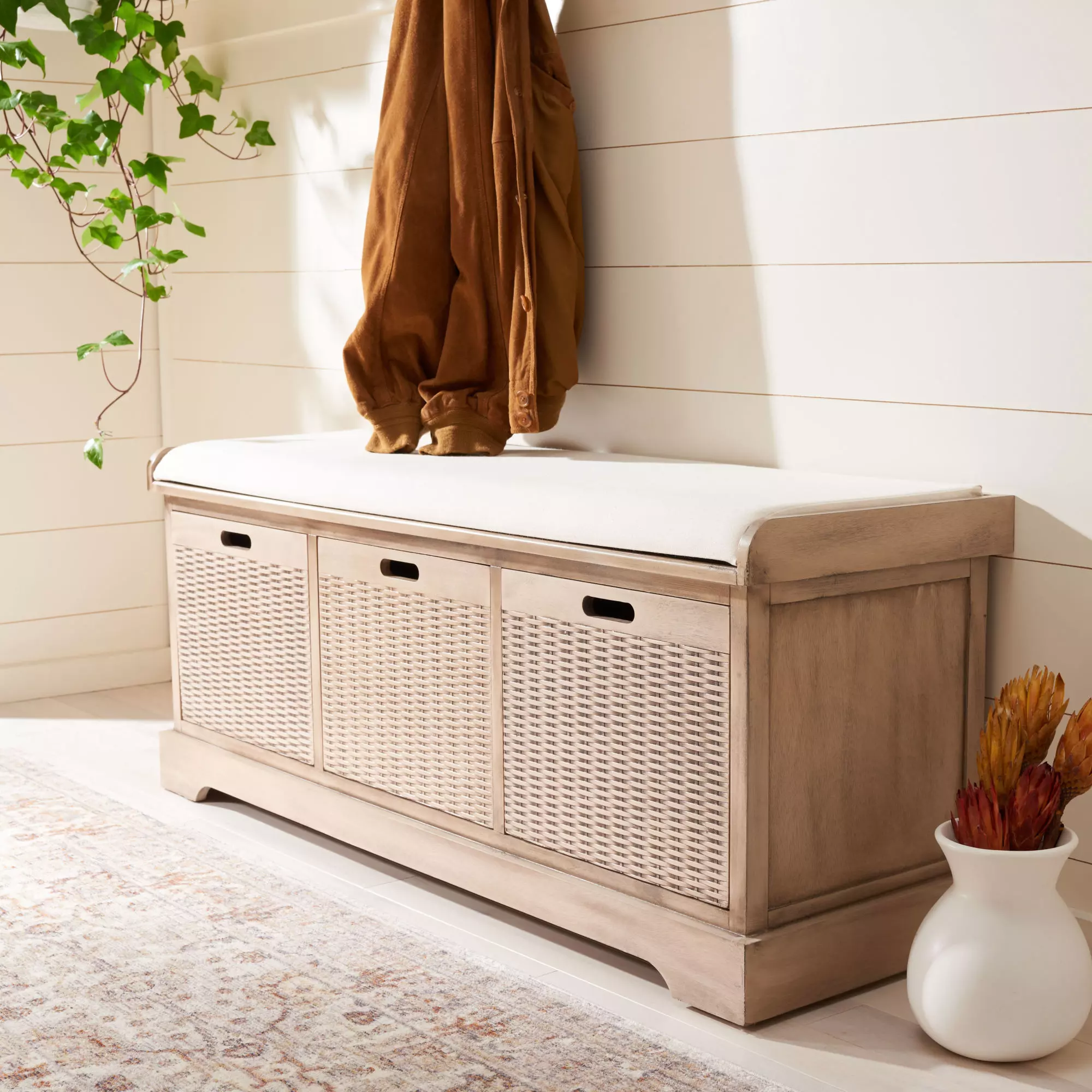 This Landers Cushion Storage Bench performs double duty as a stylish storage solution and perfect seating in an entryway or mud room. Landers gives your décor a touch of contemporary farmhouse charm with its soft sand finish and three spacious basket drawers.