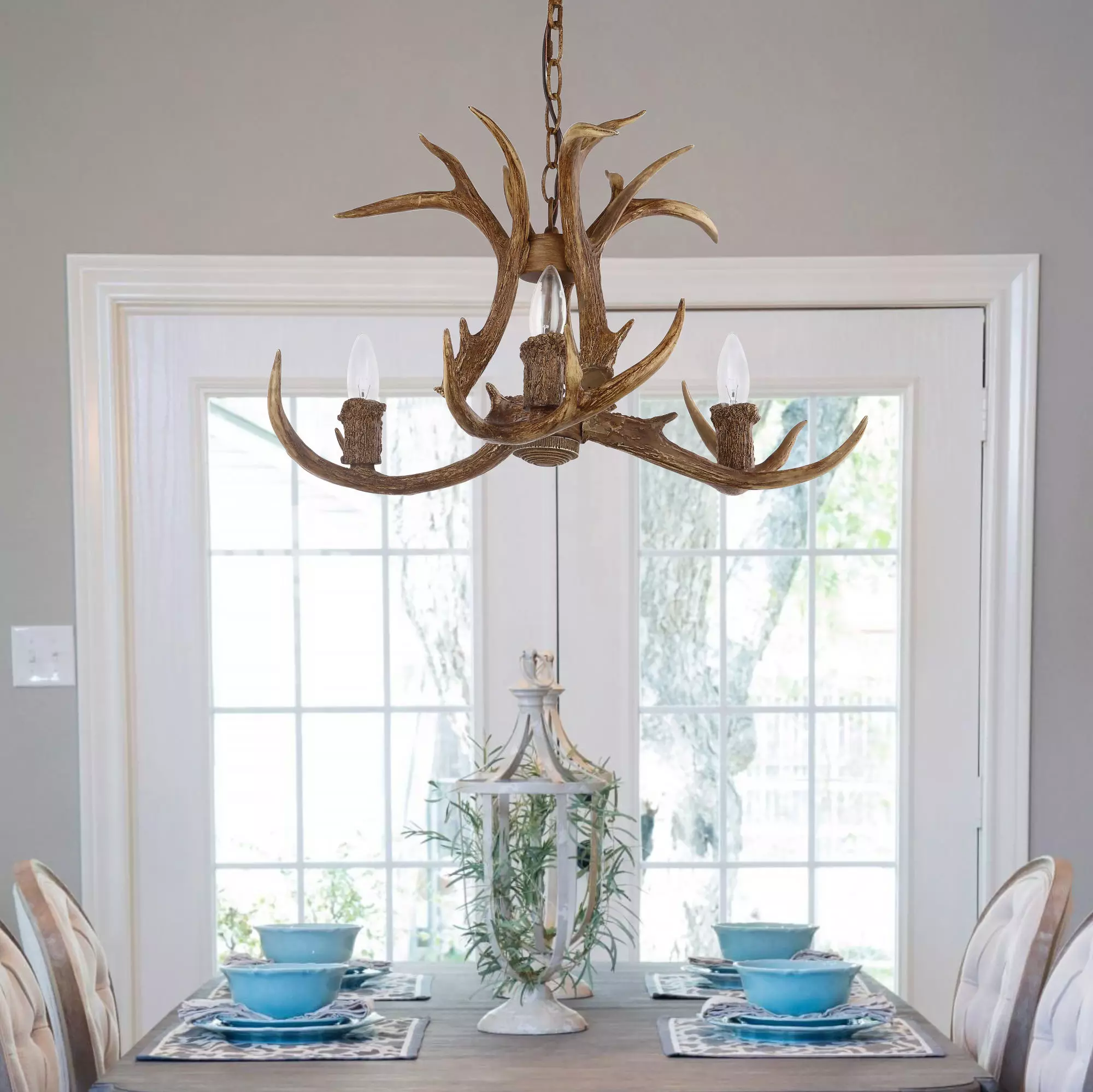 This nature-inspired antler chandelier brings rustic modern style to any living room, dining room or foyer. Crafted with iron and resin, its faux antlers add an abundance of unique character. A designer favorite.Before cleaning any lamp shade or fixture, disconnect the power source. Wipe with a soft, dry cloth. Avoid the use of chemicals and household cleaners as they may damage the finish.