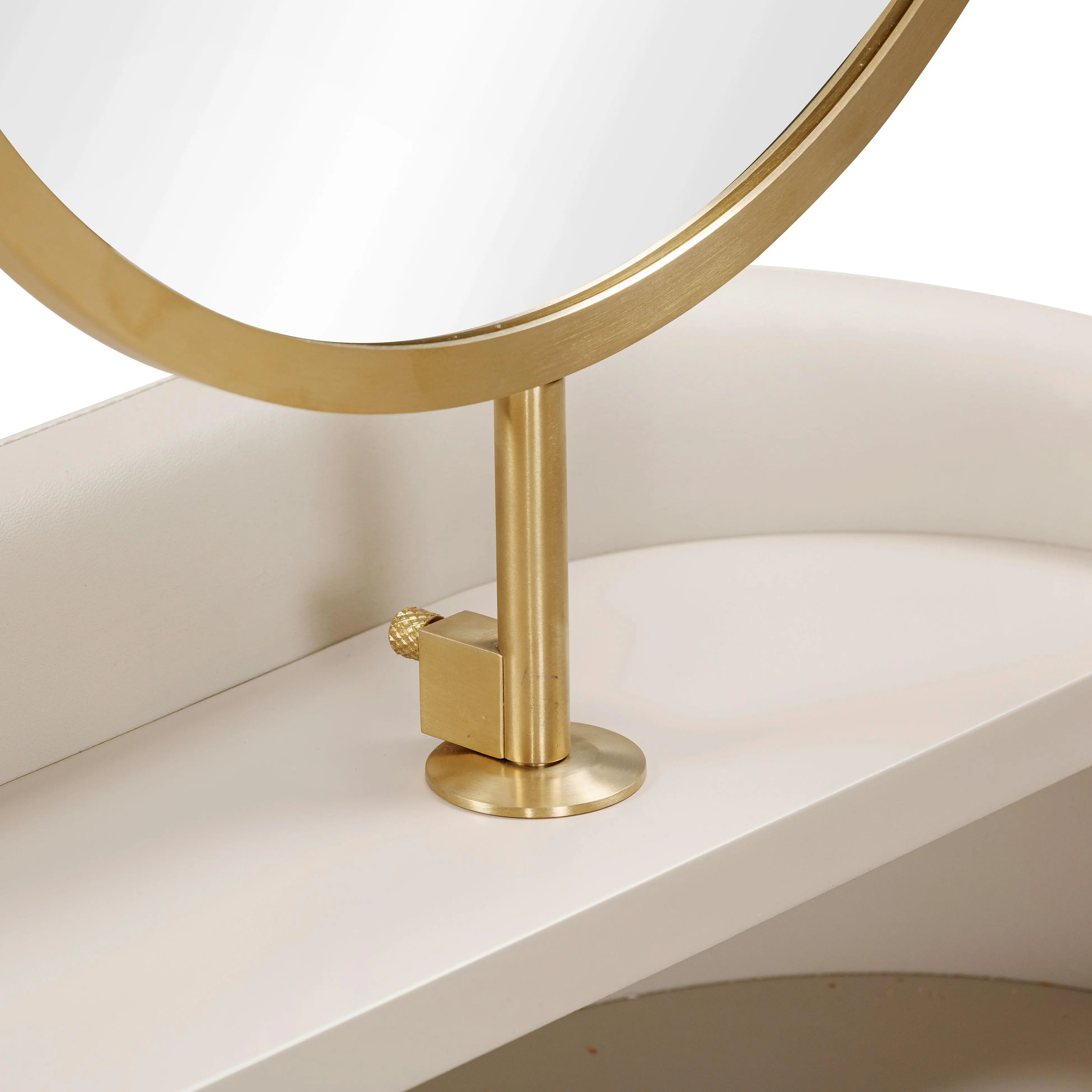 Indulge in the boutique hotel elegance of the Penelope Vegan Leather Wrapped Vanity Desk. This piece oozes sophistication with its uber-chic design, while its velvet-lined drawer and convenient shelf provide a touch of luxury for all your beauty essentials. Complete with a glamorous attached mirror, it's the perfect companion for those "Get Ready with Me" moments, making your daily routine feel like a red-carpet event. Available in Cream or Taupe.