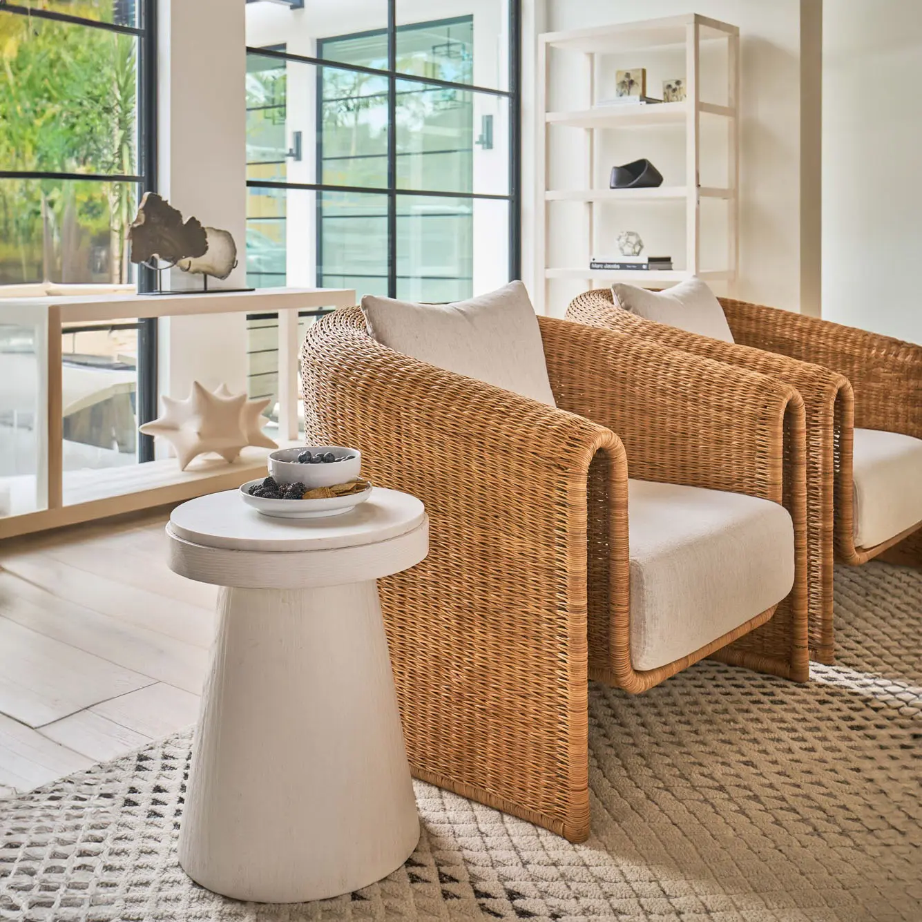 An intricate fishbone weave encases the unique silhouette of the Key Largo Lounge Chair and its plush white cushions bring the finishing touch for this relaxing piece.