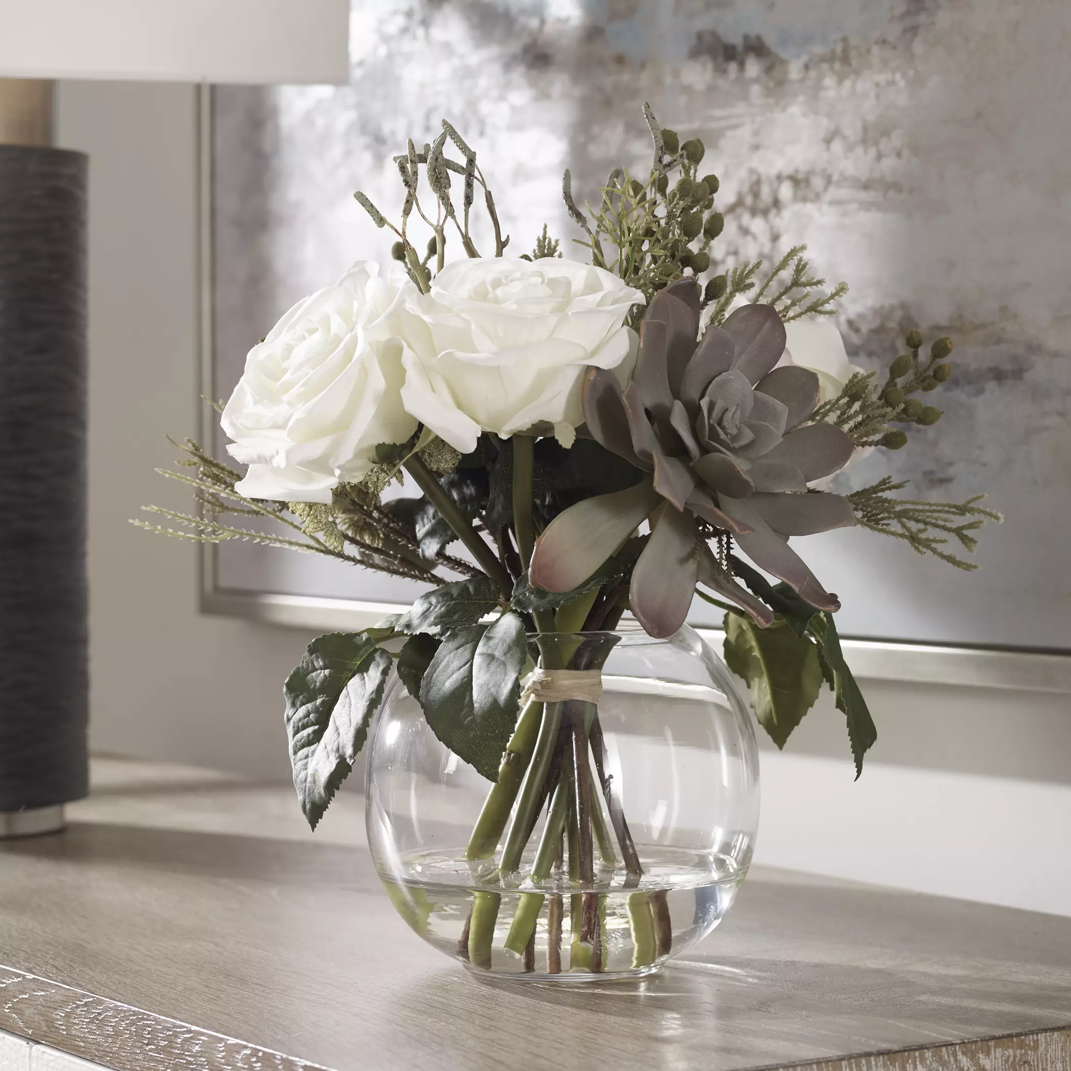 Modern Floral Bouquet Features A Unique Mix Of Berries, Greenery, Seed Pods, Succulents And Cream Roses In A Clear Glass Bud Vase With Faux Water.